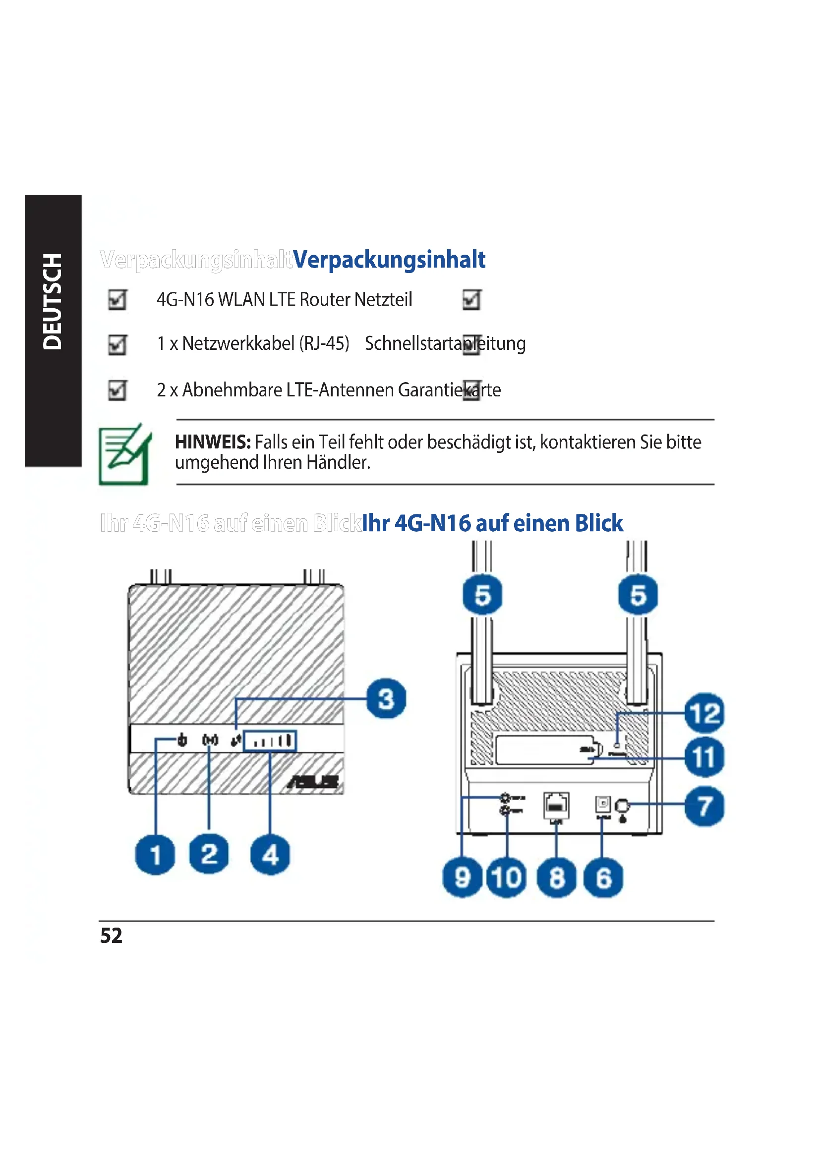 HINWEIS: Falls ein Teil fehlt oder beschädigt ist, kontaktieren Sie bitte umgehend Ihren Händler. VerpackungsinhaltVerpackungsinhalt 4G-N16 WLAN LTE Router Netzteil 1 x Netzwerkkabel (RJ-45) Schnellstartanleitung 2 x Abnehmbare LTE-Antennen Garantiekarte Ihr 4G-N16 auf einen BlickIhr 4G-N16 auf einen Blick DeutschDEUTSCH