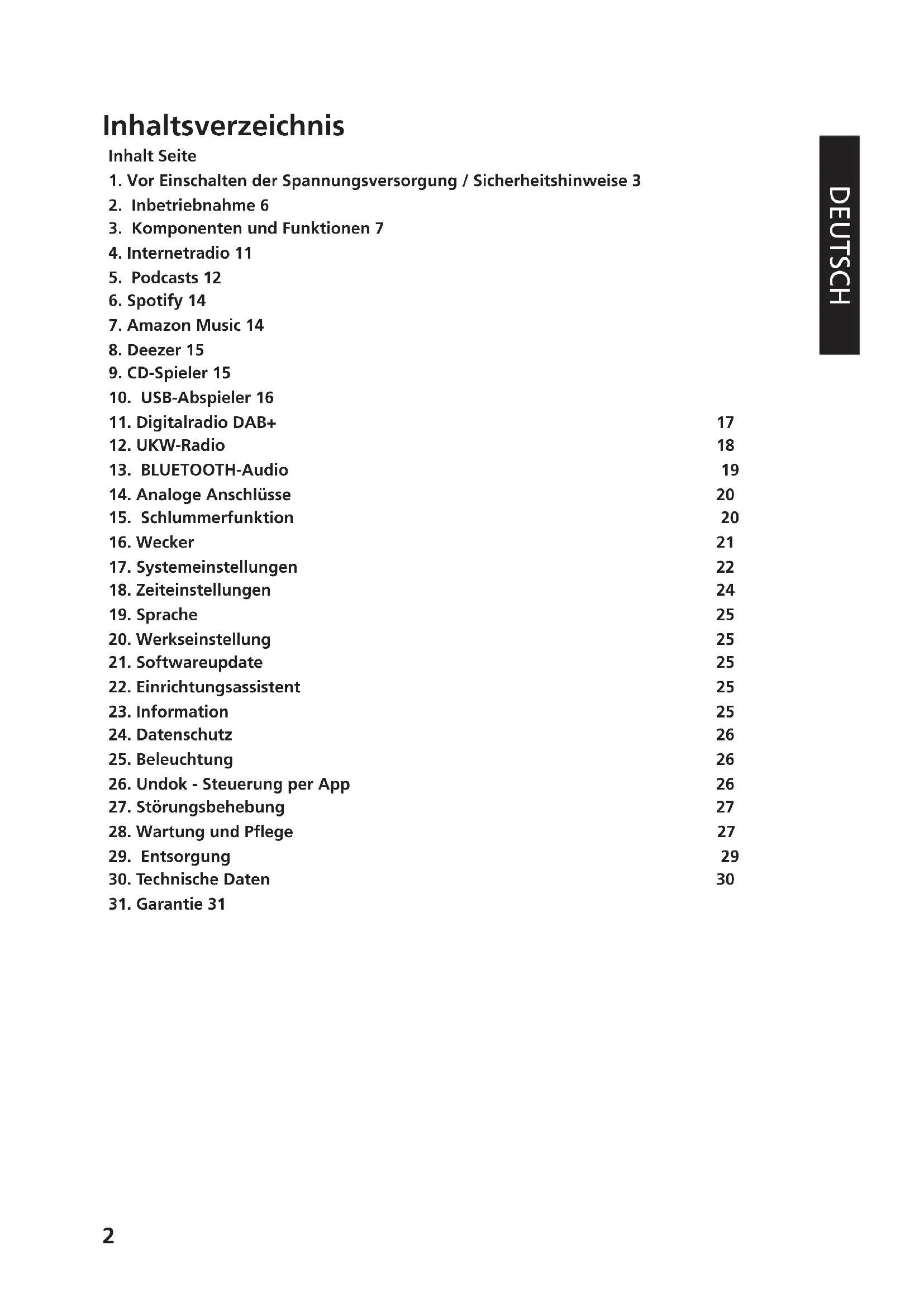 CR-ST700SCD BEDIENUNGSANLEITUNG DEUTSCH FRANÇAIS ITALIANOENGLISH NEDERLANDS2 Inhaltsverzeichnis Inhalt Seite1. Vor Einschalten der Spannungsversorgung / Sicherheitshinweise 32. Inbetriebnahme 63. Komponenten und Funktionen 74. Internetradio 115. Podcasts 126. Spotify 147. Amazon Music 148. Deezer 159. CD-Spieler 1510. USB-Abspieler 1611. Digitalradio DAB+ 1712. UKW-Radio 1813. BLUETOOTH-Audio 1914. Analoge Anschlüsse 2015. Schlummerfunktion 2016. Wecker 2117. Systemeinstellungen 2218. Zeiteinstellungen 2419. Sprache 2520. Werkseinstellung 2521. Softwareupdate 2522. Einrichtungsassistent 2523. Information 2524. Datenschutz 2625. Beleuchtung 2626. Undok - Steuerung per App 2627. Störungsbehebung 2728. Wartung und Pege 2729. Entsorgung 2930. Technische Daten 3031. Garantie 31