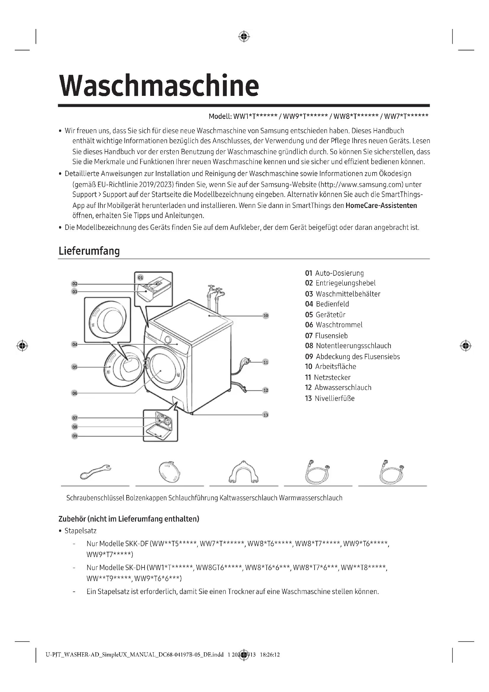 Kindern) mit verringerten körperlichen, sensorischen oder mentalen Fähigkeiten oder einem Mangel an Erfahrung und Wissen bestimmt, sofern sie nicht von einer für ihre Sicherheit verantwortliche Person im Umgang mit dem Gerät unterwiesen wurden und von dieser beaufsichtigt werden. U-PJT_WASHER-AD_SimpleUX_MANUAL_DC68-04197B-05_DE.indd 2 2022/7/13 18:26:12Deutsch 3 Sicherheitsinformationen