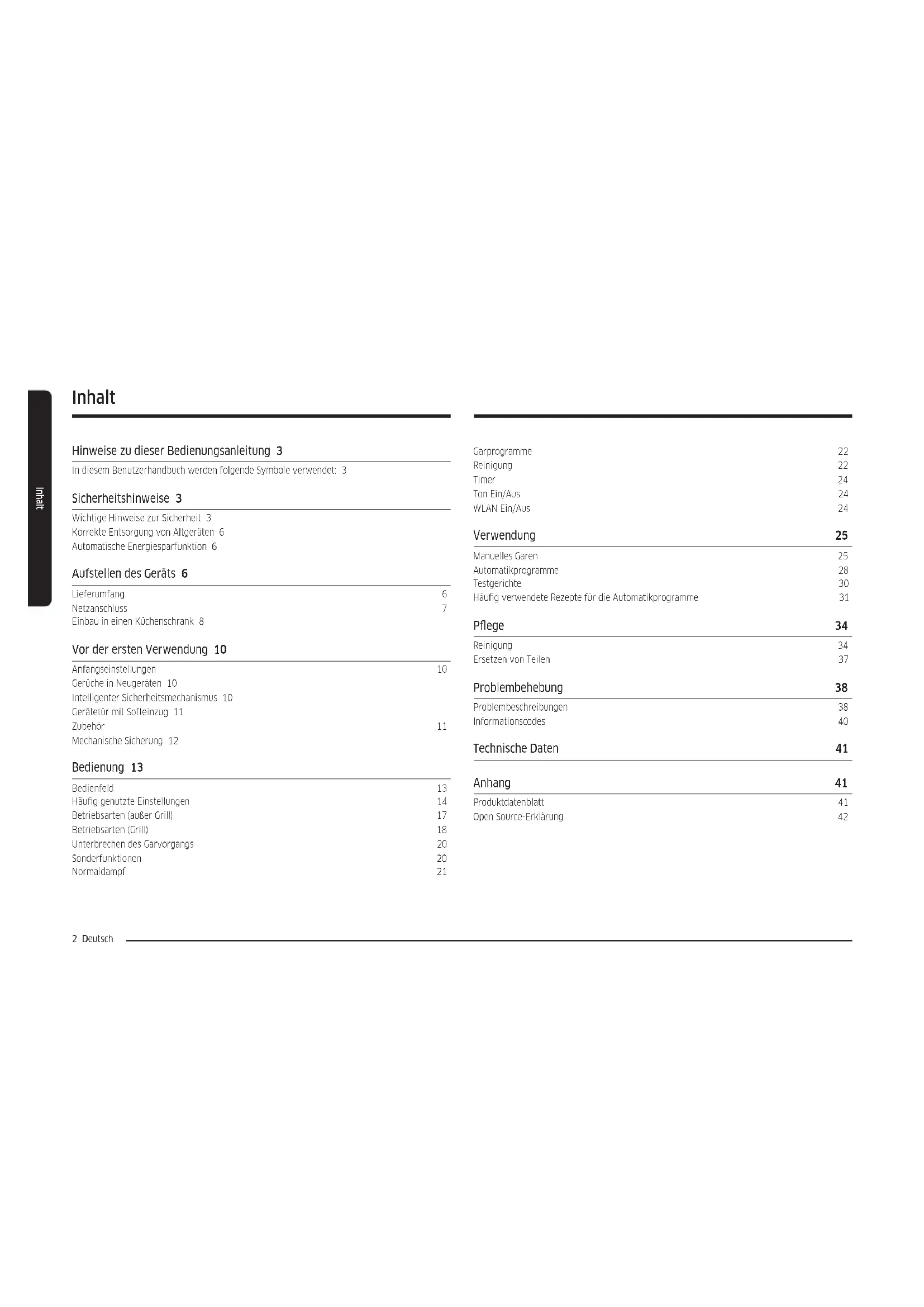 - (opłata według taryfy operatora) http://www.samsung.com/pl/support/ ROMANIA 0800872678 - Apel gratuit *8000 - Apel tarifat în reţea www.samsung.com/ro/support SERBIA 011 321 6899 www.samsung.com/rs/support SLOVAKIA 0800 - SAMSUNG (0800-726 786) www.samsung.com/sk/support LITHUANIA 8-800-77777 www.samsung.com/lt/support LATVIA 8000-7267 www.samsung.com/lv/support ESTONIA 800-7267 www.samsung.com/ee/support SLOVENIA 080 697 267 (brezplačna številka) www.samsung.com/si/support KOSOVO 038 40 30 90 www.samsung.com/support DG68-01414C-01Einbaubackofen Benutzer- und Installationshandbuch NV7B411**** / NV7B412**** / NV7B413**** / NV7B414**** / NV7B415**** / NV7B411**C* / NV7B412**C* / NV7B414**C*2 Deutsch Inhalt Inhalt Hinweise zu dieser Bedienungsanleitung 3 In diesem Benutzerhandbuch werden folgende Symbole verwendet: 3 Sicherheitshinweise 3 Wichtige Hinweise zur Sicherheit 3 Korrekte Entsorgung von Altgeräten 6 Automatische Energiesparfunktion 6 Aufstellen des Geräts 6 Lieferumfang 6 Netzanschluss 7 Einbau in einen Küchenschrank 8 Vor der ersten Verwendung 10 Anfangseinstellungen 10 Gerüche in Neugeräten 10 Intelligenter Sicherheitsmechanismus 10 Gerätetür mit Softeinzug 11 Zubehör 11 Mechanische Sicherung 12 Bedienung 13 Bedienfeld 13 Häug genutzte Einstellungen 14 Betriebsarten (außer Grill) 17 Betriebsarten (Grill) 18 Unterbrechen des Garvorgangs 20 Sonderfunktionen 20 Normaldampf 21 Garprogramme 22 Reinigung 22 Timer 24 Ton Ein/Aus 24 WLAN Ein/Aus 24 Verwendung 25 Manuelles Garen 25 Automatikprogramme 28 Testgerichte 30 Häug verwendete Rezepte für die Automatikprogramme 31 Pege 34 Reinigung 34 Ersetzen von Teilen 37 Problembehebung 38 Problembeschreibungen 38 Informationscodes 40 Technische Daten 41 Anhang 41 Produktdatenblatt 41 Open Source-Erklärung 42Deutsch 3 Hinweise zu dieser Bedienungsanleitung Sicherheitshinweise Die Installation dieses Geräts darf nur von einem zugelassenen Elektriker durchgeführt werden. Der Installateur ist dafür verantwortlich, das Gerät an das Stromnetz anzuschließen und dabei die einschlägigen Sicherheitsbestimmungen zu beachten.