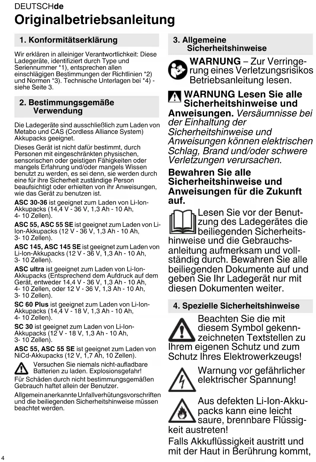 Die Ladegeräte sind ausschließlich zum Laden von Metabo und CAS (Cordless Alliance System) Akkupacks geeignet.