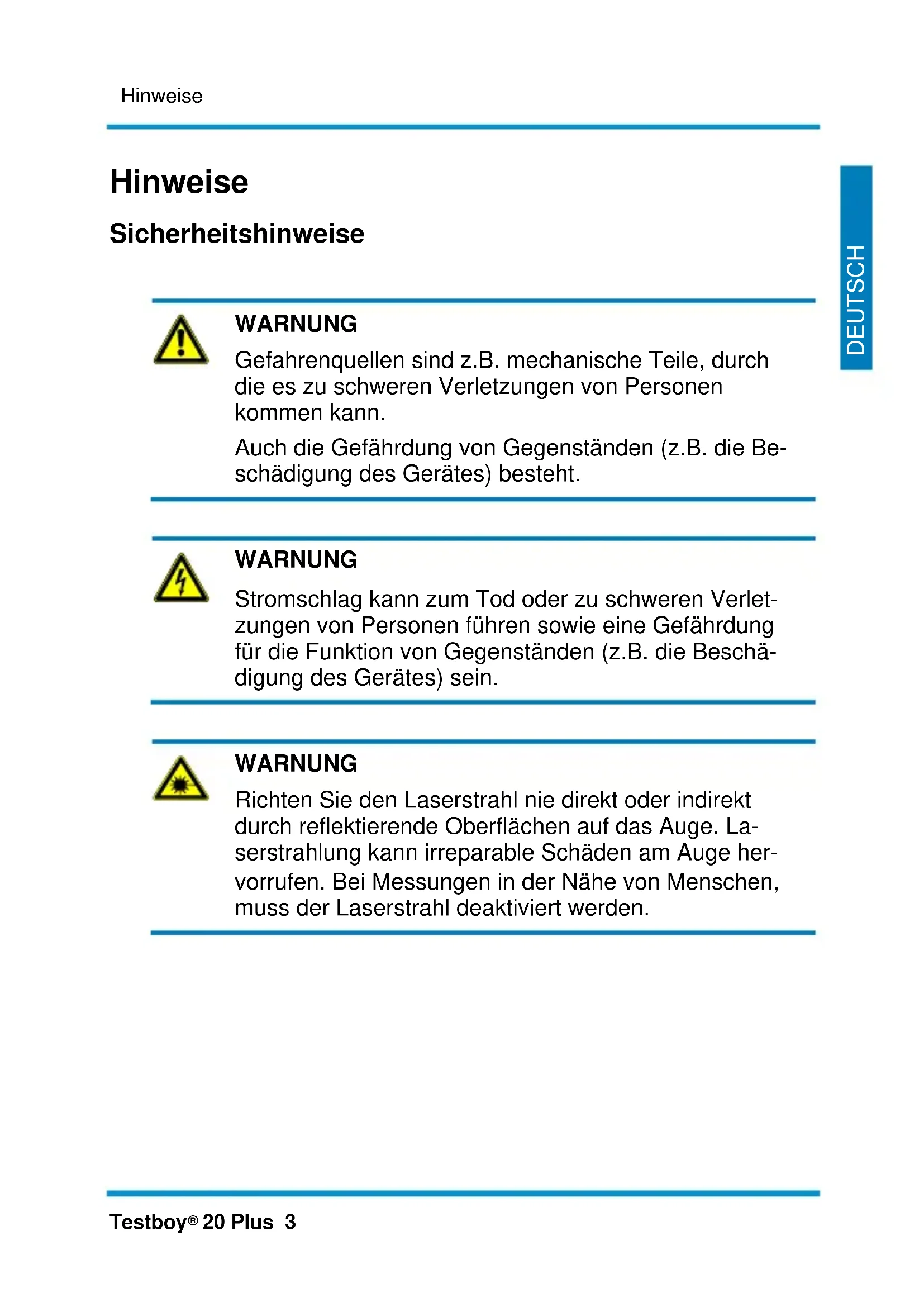 WARNUNG Richten Sie den Laserstrahl nie direkt oder indirekt durch reflektierende Oberflächen auf das Auge. La- serstrahlung kann irreparable Schäden am Auge her- vorrufen. Bei Messungen in der Nähe von Menschen, muss der Laserstrahl deaktiviert werden.Hinweise 4 Testboy