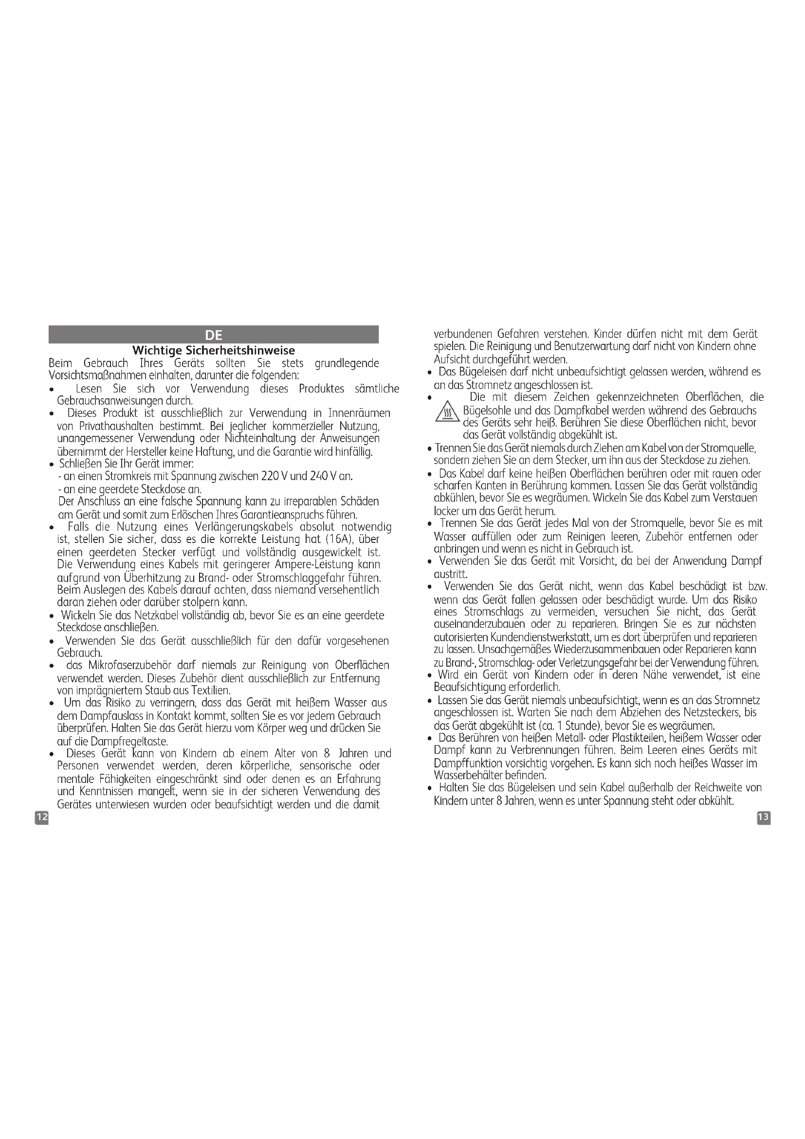 Es wird kein Dampf erzeugt.Das Gerät ist nicht korrekt angeschlossen oder wurde nicht eingeschaltet.Überprüfen Sie, ob Ihr Gerät korrekt angeschlossen und eingeschaltet ist.Der Wasserstand ist zu niedrig. Gerät ausstecken und nachfüllen.Die Dampfpumpe saugt nicht an.Halten Sie den Dampfauslöser einige Sekunden lang gedrückt, um Dampf zu erzeugen.Sie verwenden das Gerät zum ersten Mal.Halten Sie den Dampfauslöser einige Sekunden lang gedrückt, um Dampf zu erzeugen.Der Wassertank ist nicht korrekt eingesetzt.Stellen Sie sicher, dass der Verschluss richtig aufsitzt und dass der Wassertank einrastet, wenn er eingesetzt wird.Das Gerät befindet sich im Standby-Modus* oder im automatischen Abschaltmodus*.BITTE LESEN SIE IM Abschnitt „STANDBY/AUTOMATISCHE ABSCHALTUNG“ WEITERDas Gerät heizt sich nicht auf.Es ist nicht korrekt angeschlossen oder wurde nicht eingeschaltet.Schließen Sie Ihr Gerät an und schalten Sie es ein.Das Gerät befindet sich im Standby-Modus* oder im automatischen Abschaltmodus*.BITTE LESEN SIE IM Abschnitt „STANDBY/AUTOMATISCHE ABSCHALTUNG“ WEITERWasser tritt aus.Der Wassertank ist nicht richtig eingesetzt oder der Verschluss sitzt nicht richtig auf.Stellen Sie sicher, dass der Verschluss richtig aufsitzt und dass der Wassertank einrastet, wenn er eingesetzt wird.Der Boost-Modus wurde zu oft verwendet (mehr als 3 Mal pro Minute)Benutzen Sie den Boost nach Möglichkeit nicht mehr als drei Mal pro Minute.Die Dampfleistung nimmt ab.Im Gerät hat sich Kalk gesammeltLesen Sie zur weiteren Vorgehensweise bitte den Abschnitt „ANTIKALK“.Der Dampf hinterlässt Flecken auf dem Stoff oder das Gerät macht zischende Geräusche.Sie verwenden Wasser mit Zusätzen.Setzen Sie dem Wasser im Wassertank niemals irgendetwas zu.Das Gerät wurde nach dem Entkalkungsvorgang nicht ausreichend gereinigt.Lesen Sie zur weiteren Vorgehensweise bitte sorgfältig den Abschnitt „ANTIKALK“.Sie verwenden andere Flüssigkeiten als weißen Essig, um das Produkt zu entkalken.Verwenden Sie während des „ANTIKALK“-Verfahrens nur weißen Essig.Das Gerät stößt ununterbrochen Dampf aus. Der Dampfauslöser befindet sich in der Verriegelungsposition.Entriegeln Sie den Dampfauslöser.Die Mikrofaser-Bürstenhalterung* wird vom Dampfkopf entfernt. Das Mikrofaserteil*wird von der Mikrofaser-Bürstenhalterung* entfernt.Sie reiben das Textil zu fest.Reiben Sie das Textil vorsichtig, um tiefsitzenden Staub zu entfernen.17