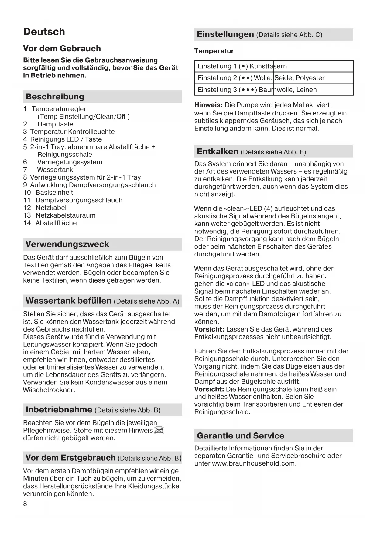 off chemicals abrasive Storage Care & Cleaning Lock System 5712812311_IS1012_1014_INT.indd 7 26.03.20 11:398 Deutsch Vor dem Gebrauch Bitte lesen Sie die Gebrauchsanweisung sorgfältig und vollständig, bevor Sie das Gerät in Betrieb nehmen. Beschreibung 1 Temperaturregler (Temp Einstellung/Clean/Off ) 2 Dampftaste 3 Temperatur Kontrollleuchte 4 Reinigungs LED / Taste 5 2-in-1 Tray: abnehmbare Abstellfl äche + Reinigungsschale 6 Verriegelungssystem 7 Wassertank 8 Verriegelungssystem für 2-in-1 Tray 9 Aufwicklung Dampfversorgungsschlauch 10 Basiseinheit 11 Dampfversorgungsschlauch 12 Netzkabel 13 Netzkabelstauraum 14 Abstellfl äche Verwendungszweck Das Gerät darf ausschließlich zum Bügeln von Textilien gemäß den Angaben des Pflegeetiketts verwendet werden. Bügeln oder bedampfen Sie keine Textilien, wenn diese getragen werden. Wassertank befüllen (Details siehe Abb. A) Stellen Sie sicher, dass das Gerät ausgeschaltet ist. Sie können den Wassertank jederzeit während des Gebrauchs nachfüllen. Dieses Gerät wurde für die Verwendung mit Leitungswasser konzipiert. Wenn Sie jedoch in einem Gebiet mit hartem Wasser leben, empfehlen wir Ihnen, entweder destilliertes oder entmineralisiertes Wasser zu verwenden, um die Lebensdauer des Geräts zu verlängern. Verwenden Sie kein Kondenswasser aus einem Wäschetrockner. Inbetriebnahme (Details siehe Abb. B) Beachten Sie vor dem Bügeln die jeweiligen Pflegehinweise. Stoffe mit diesem Hinweis dürfen nicht gebügelt werden. Vor dem Erstgebrauch (Details siehe Abb. B) Vor dem ersten Dampfbügeln empfehlen wir einige Minuten über ein Tuch zu bügeln, um zu vermeiden, dass Herstellungsrückstände Ihre Kleidungsstücke verunreinigen könnten. Einstellungen (Details siehe Abb. C) Temperatur Einstellung 1 (•) Kunstfasern Einstellung 2 (••) Wolle, Seide, Polyester Einstellung 3 (•••) Baumwolle, Leinen Hinweis: Die Pumpe wird jedes Mal aktiviert, wenn Sie die Dampftaste drücken. Sie erzeugt ein subtiles klapperndes Geräusch, das sich je nach Einstellung ändern kann. Dies ist normal. Entkalken (Details siehe Abb. E) Das System erinnert Sie daran – unabhängig von der Art des verwendeten Wassers – es regelmäßig zu entkalken. Die Entkalkung kann jederzeit durchgeführt werden, auch wenn das System dies nicht anzeigt. Wenn die «clean»-LED (4) aufleuchtet und das akustische Signal während des Bügelns angeht, kann weiter gebügelt werden. Es ist nicht notwendig, die Reinigung sofort durchzuführen. Der Reinigungsvorgang kann nach dem Bügeln oder beim nächsten Einschalten des Gerätes durchgeführt werden. Wenn das Gerät ausgeschaltet wird, ohne den Reinigungsprozess durchgeführt zu haben, gehen die «clean»-LED und das akustische Signal beim nächsten Einschalten wieder an. Sollte die Dampffunktion deaktiviert sein, muss der Reinigungsprozess durchgeführt werden, um mit dem Dampfbügeln fortfahren zu können. Vorsicht: Lassen Sie das Gerät während des Entkalkungsprozesses nicht unbeaufsichtigt. Führen Sie den Entkalkungsprozess immer mit der Reinigungsschale durch. Unterbrechen Sie den Vorgang nicht, indem Sie das Bügeleisen aus der Reinigungsschale nehmen, da heißes Wasser und Dampf aus der Bügelsohle austritt. Vorsicht: Die Reinigungsschale kann heiß sein und heißes Wasser enthalten. Seien Sie vorsichtig beim Transportieren und Entleeren der Reinigungsschale. Garantie und Service Detaillierte Informationen finden Sie in der separaten Garantie- und Servicebroschüre oder unter www.braunhousehold.com. 5712812311_IS1012_1014_INT.indd 8 26.03.20 11:399 Fehlerbehebung