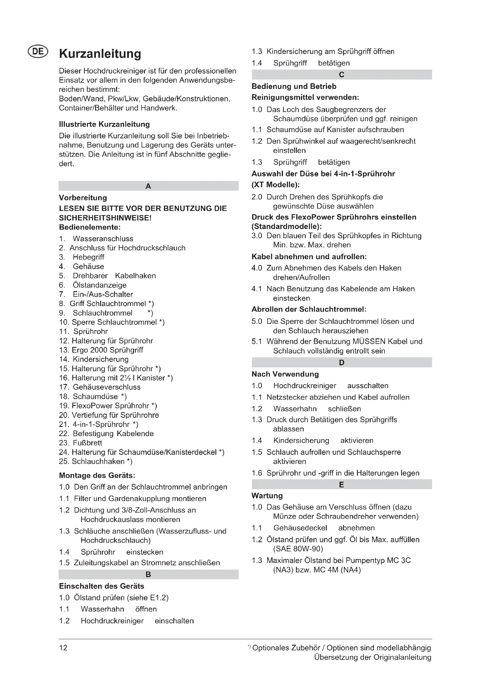 Kurzanleitung Dieser Hochdruckreiniger ist für den professionellen Einsatz vor allem in den folgenden Anwendungsbe- reichen bestimmt: Boden/Wand, Pkw/Lkw, Gebäude/Konstruktionen, Container/Behälter und Handwerk. Illustrierte Kurzanleitung Die illustrierte Kurzanleitung soll Sie bei Inbetrieb- nahme, Benutzung und Lagerung des Geräts unter- stützen. Die Anleitung ist in fünf Abschnitte geglie- dert.