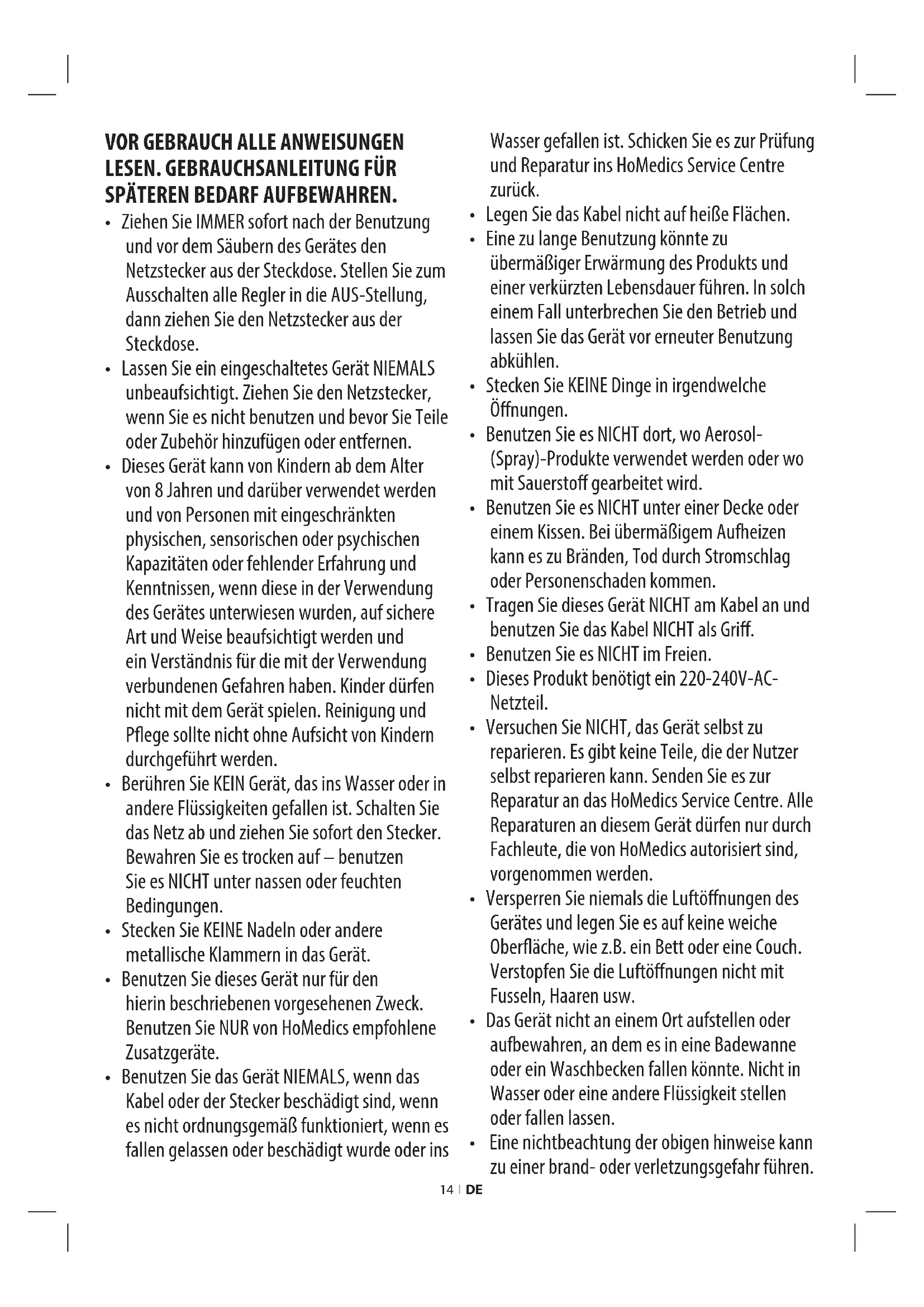 - Benutzen Sie dieses Gerät nur für den hierin beschriebenen vorgesehenen Zweck. Benutzen Sie NUR von HoMedics empfohlene Zusatzgeräte.