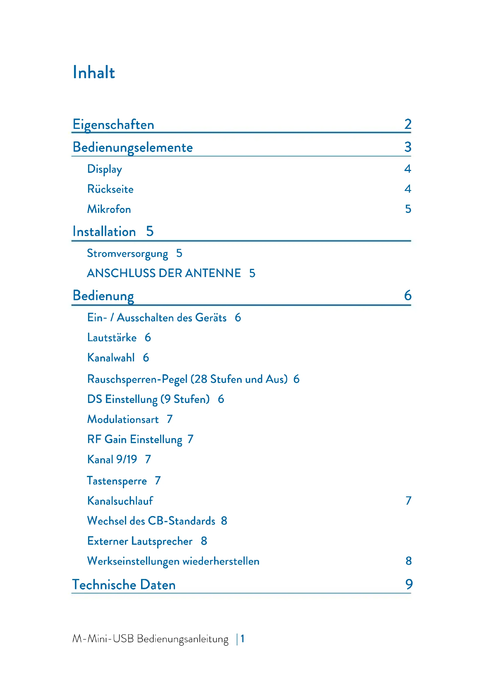 Bedienung 6 Ein- / Ausschalten des Geräts 6 Lautstärke 6 Kanalwahl 6 Rauschsperren-Pegel (28 Stufen und Aus) 6 DS Einstellung (9 Stufen) 6 Modulationsart 7 RF Gain Einstellung 7 Kanal 9/19 7 Tastensperre 7 Kanalsuchlauf 7 Wechsel des CB-Standards 8 Externer Lautsprecher 8 Werkseinstellungen wiederherstellen 8 Technische Daten 92 | M-Mini-USB Bedienungsanleitung Eigenschaften