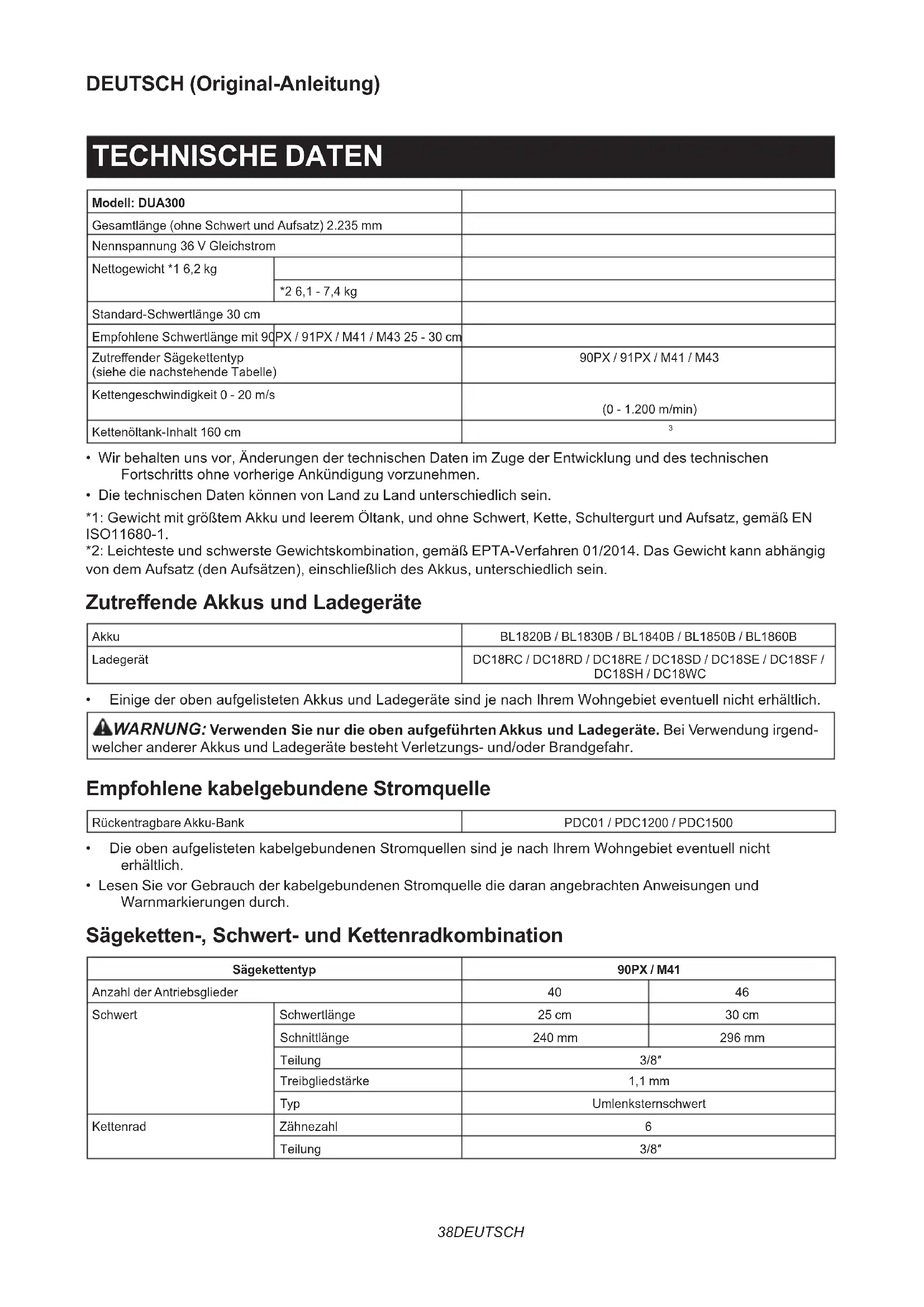 - Lesen Sie vor Gebrauch der kabelgebundenen Stromquelle die daran angebrachten Anweisungen und Warnmarkierungen durch. Sägeketten-, Schwert- und Kettenradkombination Sägekettentyp 90PX / M41 Anzahl der Antriebsglieder 40 46 Schwert Schwertlänge 25 cm 30 cm Schnittlänge 240 mm 296 mm Teilung 3/8″ Treibgliedstärke 1,1 mm Typ Umlenksternschwert Kettenrad Zähnezahl 6 Teilung 3/8″39 DEUTSCH Sägekettentyp 91PX / M43 Anzahl der Antriebsglieder 40 46 Schwert Schwertlänge 25 cm 30 cm Schnittlänge 240 mm 296 mm Teilung 3/8″ Treibgliedstärke 1,3 mm Typ Umlenksternschwert Kettenrad Zähnezahl 6 Teilung 3/8″ WARNUNG: Verwenden Sie eine geeignete Kombination von Schwert und Sägekette. Anderenfalls kann es zu Personenschaden kommen. Symbole Nachfolgend werden Symbole beschrieben, die für das Gerät verwendet werden können. Machen Sie sich unbedingt vor der Benutzung mit ihrer Bedeutung vertraut. Keiner Feuchtigkeit aussetzen. Betriebsanleitung lesen. Helm, Schutzbrille und Gehörschutz tragen. Schutzhandschuhe tragen. Festes Schuhwerk mit rutschfesten Sohlen tragen. Sicherheitsschuhe mit Stahl- Zehenkappen werden empfohlen. Vorsicht vor elektrischen Leitungen-Stromschlaggefahr. Mindestens 15 m Abstand halten. Höchstzulässige Schnittlänge Kettenumlaufrichtung Kettenöltank HeißeOberächen-Verbrennungenvon Fingern oder Händen. Ni-MH Li-ion Nur für EU-Länder Aufgrund des Vorhandenseins gefähr- licher Komponenten in der Ausrüstung können Elektro- und Elektronik-Altgeräte, Akkumulatoren und Batterien sich nega- tiv auf die Umwelt und die menschliche Gesundheit auswirken. Entsorgen Sie Elektro- und Elektronikgeräte oder Batterien nicht mit dem Hausmüll! In Übereinstimmung mit der Europäischen Richtlinie über Elektro- und Elektronik- Altgeräte, Akkumulatoren und Batterien, verbrauchte Akkumulatoren und Batterien sowie ihrer Anpassung an nati- onales Recht sollten Elektro-Altgeräte, Batterien und Akkumulatoren gemäß den Umweltschutzbestimmungen getrennt gelagert und zu einer getrennten Sammelstelle für Siedlungsabfälle geliefert werden. Dies wird durch das am Gerät angebrachte Symbol der durchgestrichenen Abfalltonne auf Rädern angezeigt. Garantierter Schallleistungspegel gemäß der EU-Richtlinie über Außenlärm. Schallleistungspegel gemäß der australi- schen NSW-Lärmschutzverordnung Vorgesehene Verwendung Das Werkzeug ist für das Abschneiden von Zweigen und Ästen vorgesehen. Geräusch Typischer A-bewerteter Geräuschpegel ermittelt gemäß ISO22868(ISO11680-1): Schalldruckpegel (L