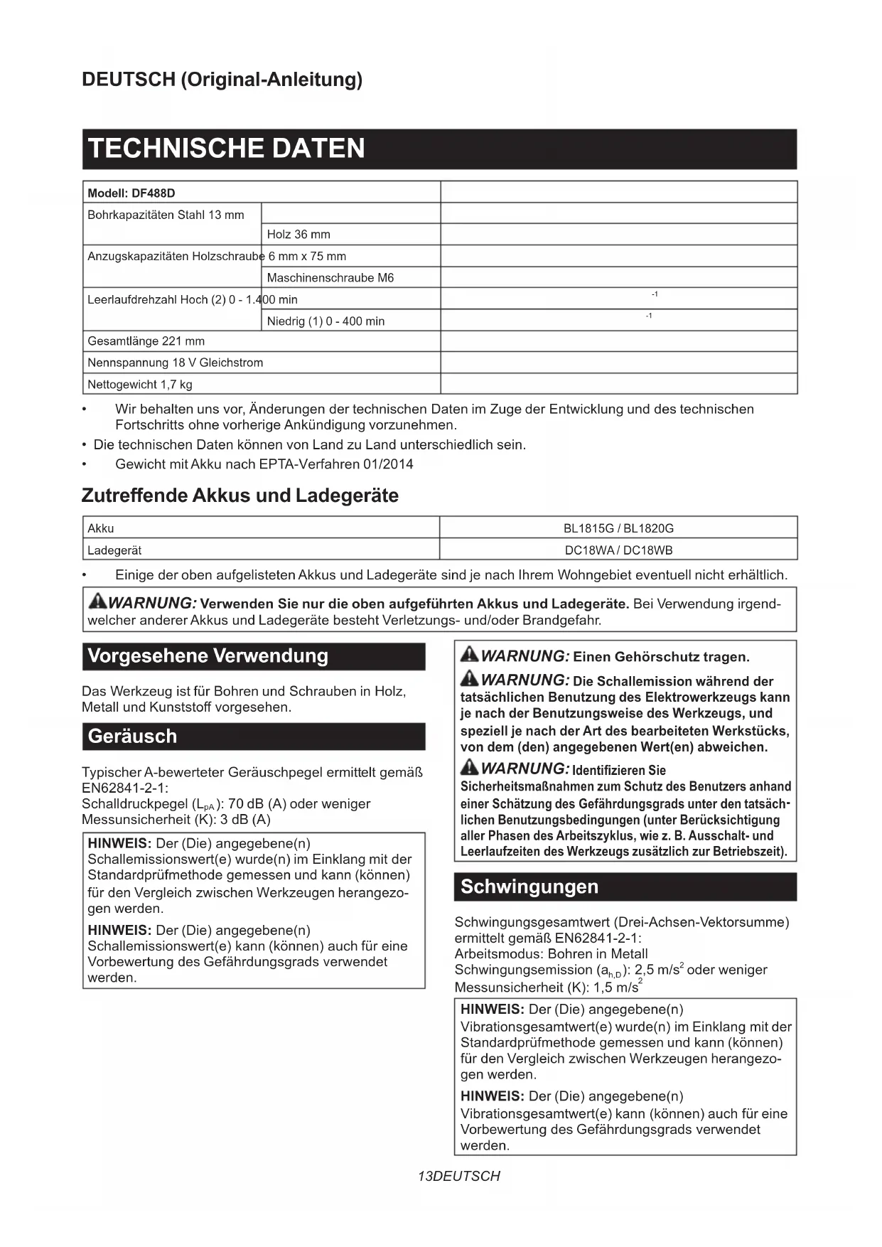 - Einige der oben aufgelisteten Akkus und Ladegeräte sind je nach Ihrem Wohngebiet eventuell nicht erhältlich. WARNUNG: Verwenden Sie nur die oben aufgeführten Akkus und Ladegeräte. Bei Verwendung irgend- welcher anderer Akkus und Ladegeräte besteht Verletzungs- und/oder Brandgefahr. Vorgesehene Verwendung Das Werkzeug ist für Bohren und Schrauben in Holz, Metall und Kunststo vorgesehen. Geräusch Typischer A-bewerteter Geräuschpegel ermittelt gemäß EN62841-2-1: Schalldruckpegel (L