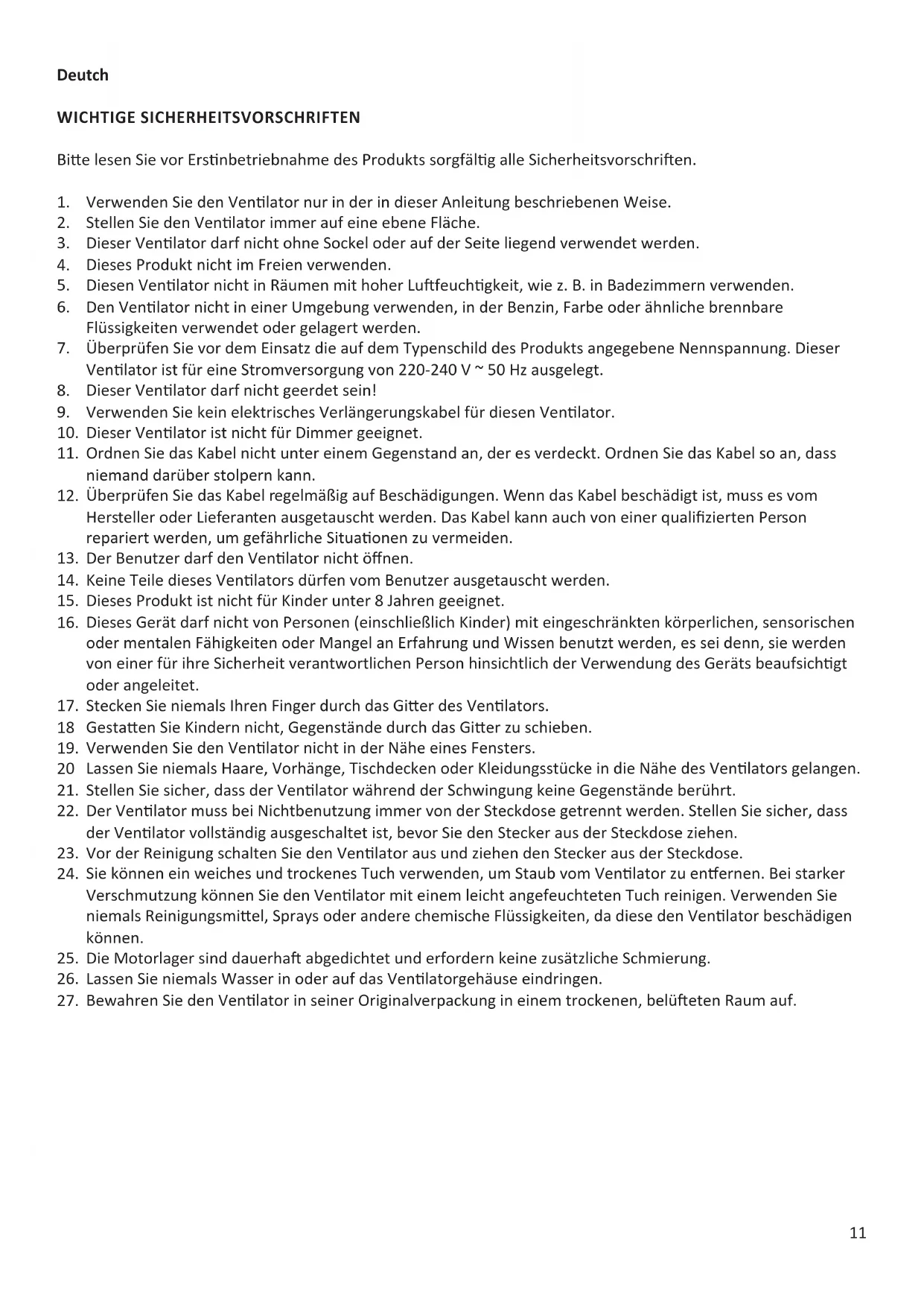 Verwenden Sie den Venlator nur in der in dieser Anleitung beschriebenen Weise. Stellen Sie den Venlator immer auf eine ebene Fläche. Dieser Venlator darf nicht ohne Sockel oder auf der Seite liegend verwendet werden. Dieses Produkt nicht im Freien verwenden. Diesen Venlator nicht in Räumen mit hoher Lufeuchgkeit, wie z. B. in Badezimmern verwenden. Den Venlator nicht in einer Umgebung verwenden, in der Benzin, Farbe oder ähnliche brennbare Flüssigkeiten verwendet oder gelagert werden. Überprüfen Sie vor dem Einsatz die auf dem Typenschild des Produkts angegebene Nennspannung. Dieser Venlator ist für eine Stromversorgung von 220-240 V ~ 50 Hz ausgelegt. Dieser Venlator darf nicht geerdet sein! Verwenden Sie kein elektrisches Verlängerungskabel für diesen Venlator. Dieser Venlator ist nicht für Dimmer geeignet. Ordnen Sie das Kabel nicht unter einem Gegenstand an, der es verdeckt. Ordnen Sie das Kabel so an, dass niemand darüber stolpern kann. Überprüfen Sie das Kabel regelmäßig auf Beschädigungen. Wenn das Kabel beschädigt ist, muss es vom Hersteller oder Lieferanten ausgetauscht werden. Das Kabel kann auch von einer qualizierten Person repariert werden, um gefährliche Situaonen zu vermeiden. Der Benutzer darf den Venlator nicht önen. Keine Teile dieses Venlators dürfen vom Benutzer ausgetauscht werden. Dieses Produkt ist nicht für Kinder unter 8 Jahren geeignet. Dieses Gerät darf nicht von Personen (einschließlich Kinder) mit eingeschränkten körperlichen, sensorischen oder mentalen Fähigkeiten oder Mangel an Erfahrung und Wissen benutzt werden, es sei denn, sie werden von einer für ihre Sicherheit verantwortlichen Person hinsichtlich der Verwendung des Geräts beaufsichgt oder angeleitet. Stecken Sie niemals Ihren Finger durch das Gier des Venlators. Gestaen Sie Kindern nicht, Gegenstände durch das Gier zu schieben. Verwenden Sie den Venlator nicht in der Nähe eines Fensters. Lassen Sie niemals Haare, Vorhänge, Tischdecken oder Kleidungsstücke in die Nähe des Venlators gelangen. Stellen Sie sicher, dass der Venlator während der Schwingung keine Gegenstände berührt. Der Venlator muss bei Nichtbenutzung immer von der Steckdose getrennt werden. Stellen Sie sicher, dass der Venlator vollständig ausgeschaltet ist, bevor Sie den Stecker aus der Steckdose ziehen. Vor der Reinigung schalten Sie den Venlator aus und ziehen den Stecker aus der Steckdose. Sie können ein weiches und trockenes Tuch verwenden, um Staub vom Venlator zu enernen. Bei starker Verschmutzung können Sie den Venlator mit einem leicht angefeuchteten Tuch reinigen. Verwenden Sie niemals Reinigungsmiel, Sprays oder andere chemische Flüssigkeiten, da diese den Venlator beschädigen können. Die Motorlager sind dauerha abgedichtet und erfordern keine zusätzliche Schmierung. Lassen Sie niemals Wasser in oder auf das Venlatorgehäuse eindringen. Bewahren Sie den Venlator in seiner Originalverpackung in einem trockenen, belüeten Raum auf.12