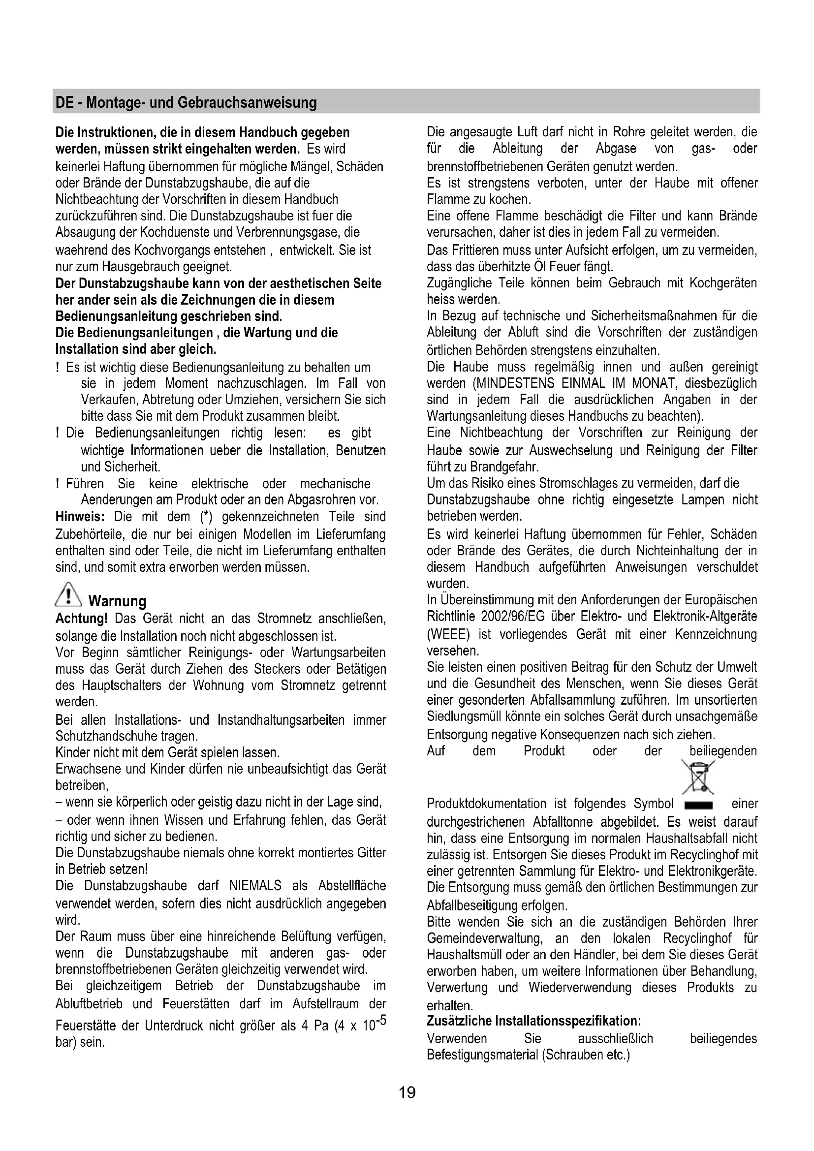 bar) sein. Die angesaugte Luft darf nicht in Rohre geleitet werden, die für die Ableitung der Abgase von gas- oder brennstoffbetriebenen Geräten genutzt werden. Es ist strengstens verboten, unter der Haube mit offener Flamme zu kochen. Eine offene Flamme beschädigt die Filter und kann Brände verursachen, daher ist dies in jedem Fall zu vermeiden. Das Frittieren muss unter Aufsicht erfolgen, um zu vermeiden, dass das überhitzte Öl Feuer fängt. Zugängliche Teile können beim Gebrauch mit Kochgeräten heiss werden. In Bezug auf technische und Sicherheitsmaßnahmen für die Ableitung der Abluft sind die Vorschriften der zuständigen örtlichen Behörden strengstens einzuhalten. Die Haube muss regelmäßig innen und außen gereinigt werden (MINDESTENS EINMAL IM MONAT, diesbezüglich sind in jedem Fall die ausdrücklichen Angaben in der Wartungsanleitung dieses Handbuchs zu beachten). Eine Nichtbeachtung der Vorschriften zur Reinigung der Haube sowie zur Auswechselung und Reinigung der Filter führt zu Brandgefahr. Um das Risiko eines Stromschlages zu vermeiden, darf die Dunstabzugshaube ohne richtig eingesetzte Lampen nicht betrieben werden. Es wird keinerlei Haftung übernommen für Fehler, Schäden oder Brände des Gerätes, die durch Nichteinhaltung der in diesem Handbuch aufgeführten Anweisungen verschuldet wurden. In Übereinstimmung mit den Anforderungen der Europäischen Richtlinie 2002/96/EG über Elektro- und Elektronik-Altgeräte (WEEE) ist vorliegendes Gerät mit einer Kennzeichnung versehen. Sie leisten einen positiven Beitrag für den Schutz der Umwelt und die Gesundheit des Menschen, wenn Sie dieses Gerät einer gesonderten Abfallsammlung zuführen. Im unsortierten Siedlungsmüll könnte ein solches Gerät durch unsachgemäße Entsorgung negative Konsequenzen nach sich ziehen. Auf dem Produkt oder der beiliegenden Produktdokumentation ist folgendes Symbol einer durchgestrichenen Abfalltonne abgebildet. Es weist darauf hin, dass eine Entsorgung im normalen Haushaltsabfall nicht zulässig ist. Entsorgen Sie dieses Produkt im Recyclinghof mit einer getrennten Sammlung für Elektro- und Elektronikgeräte. Die Entsorgung muss gemäß den örtlichen Bestimmungen zur Abfallbeseitigung erfolgen. Bitte wenden Sie sich an die zuständigen Behörden Ihrer Gemeindeverwaltung, an den lokalen Recyclinghof für Haushaltsmüll oder an den Händler, bei dem Sie dieses Gerät erworben haben, um weitere Informationen über Behandlung, Verwertung und Wiederverwendung dieses Produkts zu erhalten. Zusätzliche Installationsspezifikation: Verwenden Sie ausschließlich beiliegendes Befestigungsmaterial (Schrauben etc.)20 Verwenden Sie ausschließlich die in dieser Anleitung beschriebenen Schrauben und deren vorgegeben Längen! WARNUNG! Installation der Schrauben und Befestigungsmaterial die NICHT gemäß dieser Anleitung durchgeführt wurden, kann zu einem elektrischen Schlag führen! Betriebsart Die Haube kann sowohl als Abluftgërat als auch als Umluftgërat eingesetzt werden. Abluftbetrieb Die Luft wird mit Hilfe eines an den Abluftstutzen anzubringenden Rohres ins Freie geleitet. Das Abluftrohr wird hierbei nicht geliefert und soll separat angekauft werden. Das Abluftrohr muß denselben Durchmesser wie der Abluftstutzen aufweisen. Das Abluftrohr muß muß in waagrechter Lage leicht nach oben geneigt sein (ca. 10%), damit die Luft ungehindert ins Freie abgeleitet werden kann. Note. Sollte die Dunstabzugshaube mit Aktiv-kohlefilter versehen sein, so muß dieser entfernt werden. Die Dunstabzugshaube an Abluftrohre und Wandabluftauslass mit dem selben Durchmesser wie der Luftausgang verbinden (Anschlussflansch). Die Benutzung von Rohren und Wandabluftauslass mit geringerem Durchmesser, verursacht eine Verringerung der Abluftleistung und eine drastische Zunahme der Geraeuschentwicklung. Jegliche Verantwortung diesbezueglich wird daher abgelenkt ! Ein möglichst kurzes Rohr verwenden. ! Ein Rohrsystem mit einer möglichst geringen Anzahl von Krümmungen verwenden (max. Winkel der Krümmung: 90°). ! Starke Änderungen des Rohrdurchmessers sind zu vermeiden . ! Die Innenfläche der Rohrs muss so glatt wie möglich sein