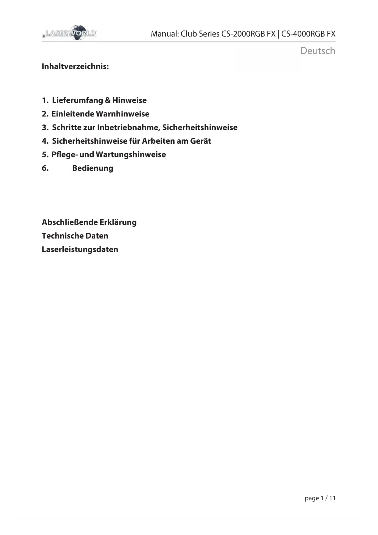 Abschließende Erklärung Technische Daten LaserleistungsdatenManual: Club Series CS-2000RGB FX | CS-4000RGB FX page 2 / 11 Deutsch