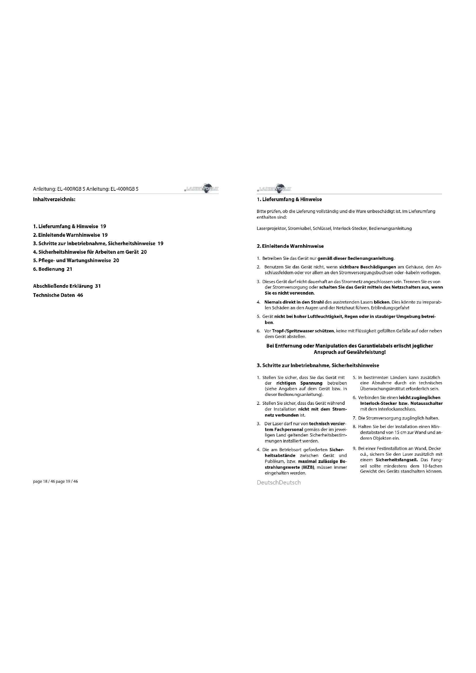 - Durch das Entfernen des Garantiela- bels erlischt jeglicher Anspruch auf Gewährleistung. Schäden am Gerät, die durch unsachgemäßer Handha- bung, Nichtbeachtung der Sicher- heits-, Pege- und Wartungshinweise entstehen besteht kein Gewährleis- tungsanspruch.Anleitung: EL-400RGB S Anleitung: EL-400RGB S page 22 / 46 page 23 / 46 DeutschDeutsch