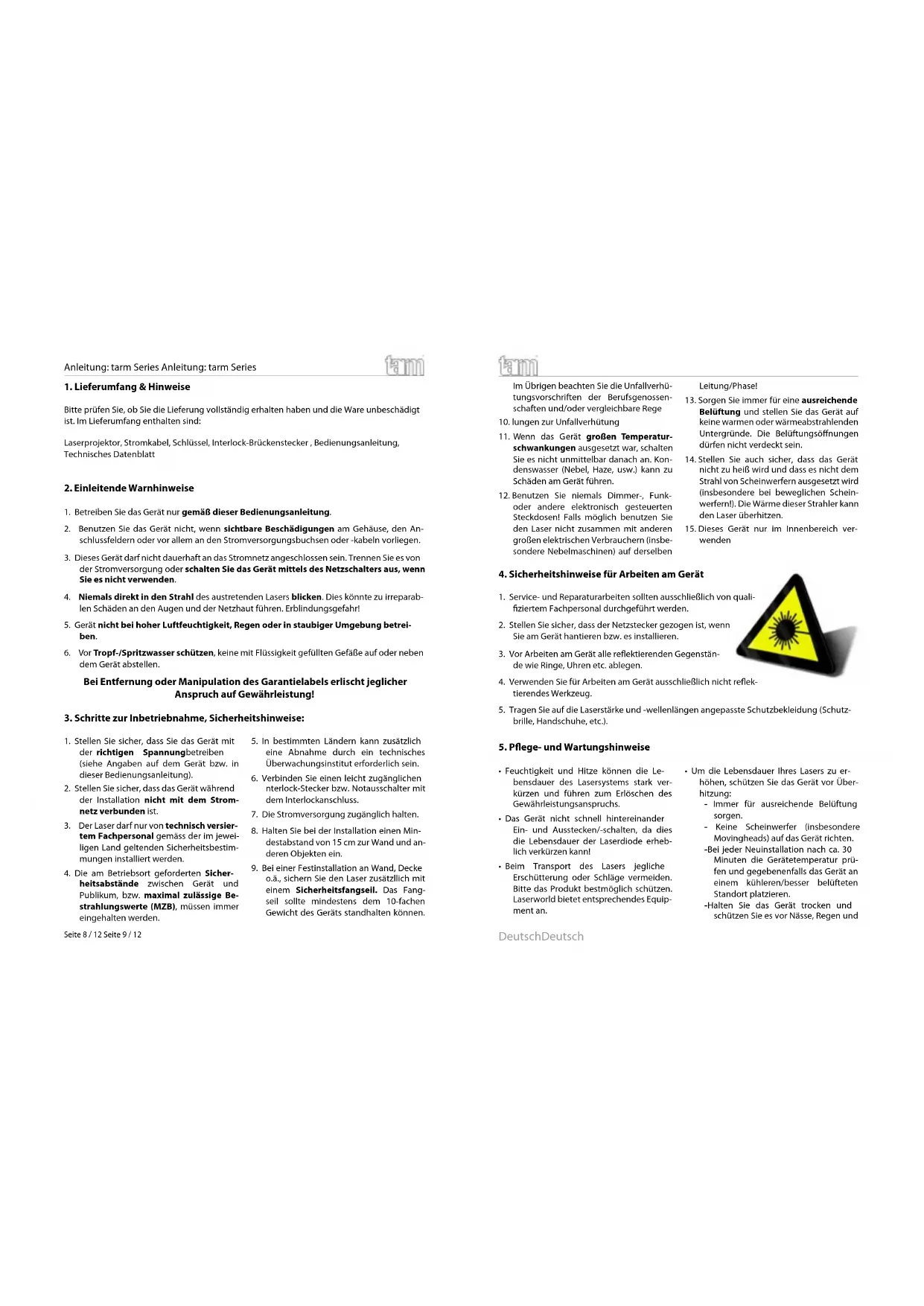 11/2021 English Deutsch Français Manual / Bedienungsanleitung / Mode d‘emploi tarm Series Please spend a few minutes to read this manual fully before operating this laser! Bitte lesen Sie diese Bedienungsanleitung sorgfältig vor Inbetriebnahme dieses Showlasersystems! Avant d’utiliser cet appareil pour la première fois nous vous recommandons de lire cette notice d’utilisation!Manual / Anleitung / Manuel: tarm Series Manual / Anleitung / Manuel: tarm Series