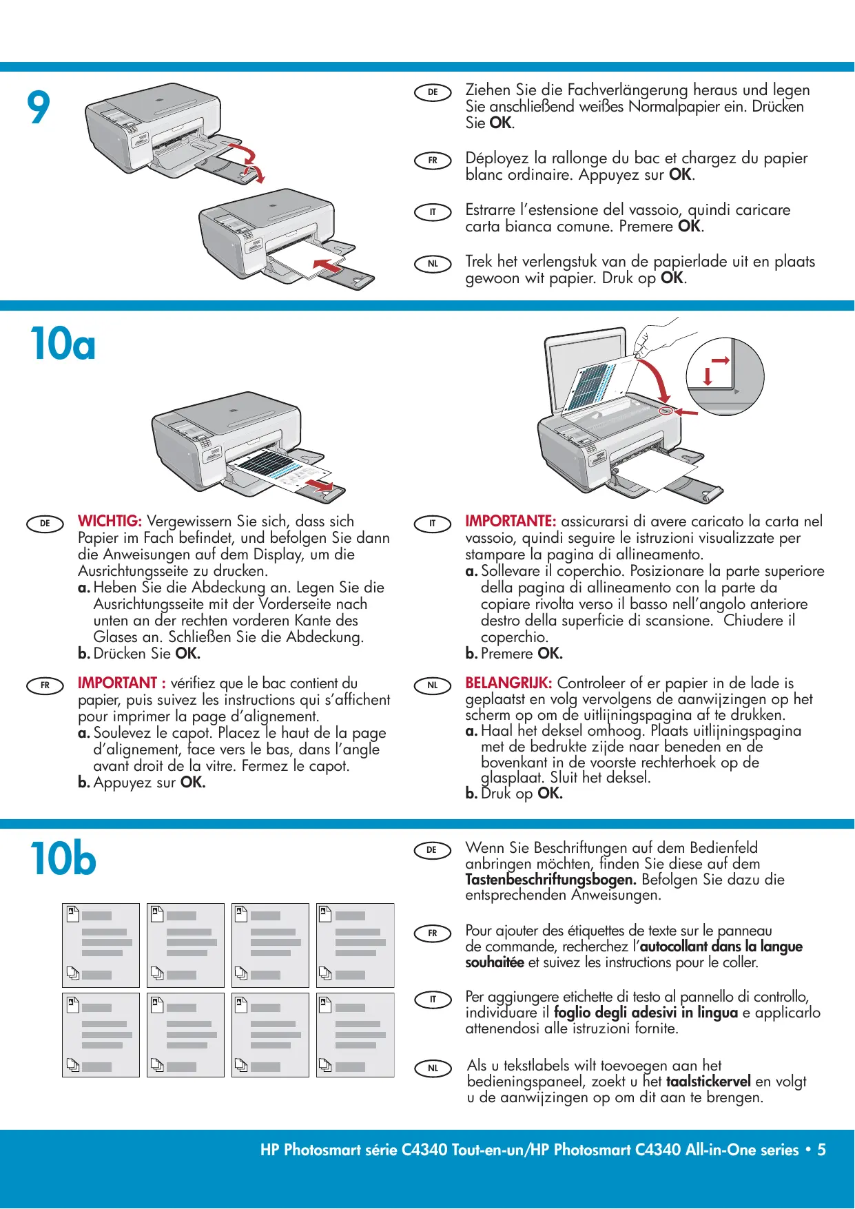 DE FR IT NL Ziehen Sie die Fachverlängerung heraus und legen Sie anschließend weißes Normalpapier ein. Drücken Sie OK. Déployez la rallonge du bac et chargez du papier blanc ordinaire. Appuyez sur OK. Estrarre l’estensione del vassoio, quindi caricare carta bianca comune. Premere OK. Trek het verlengstuk van de papierlade uit en plaats gewoon wit papier. Druk op OK.