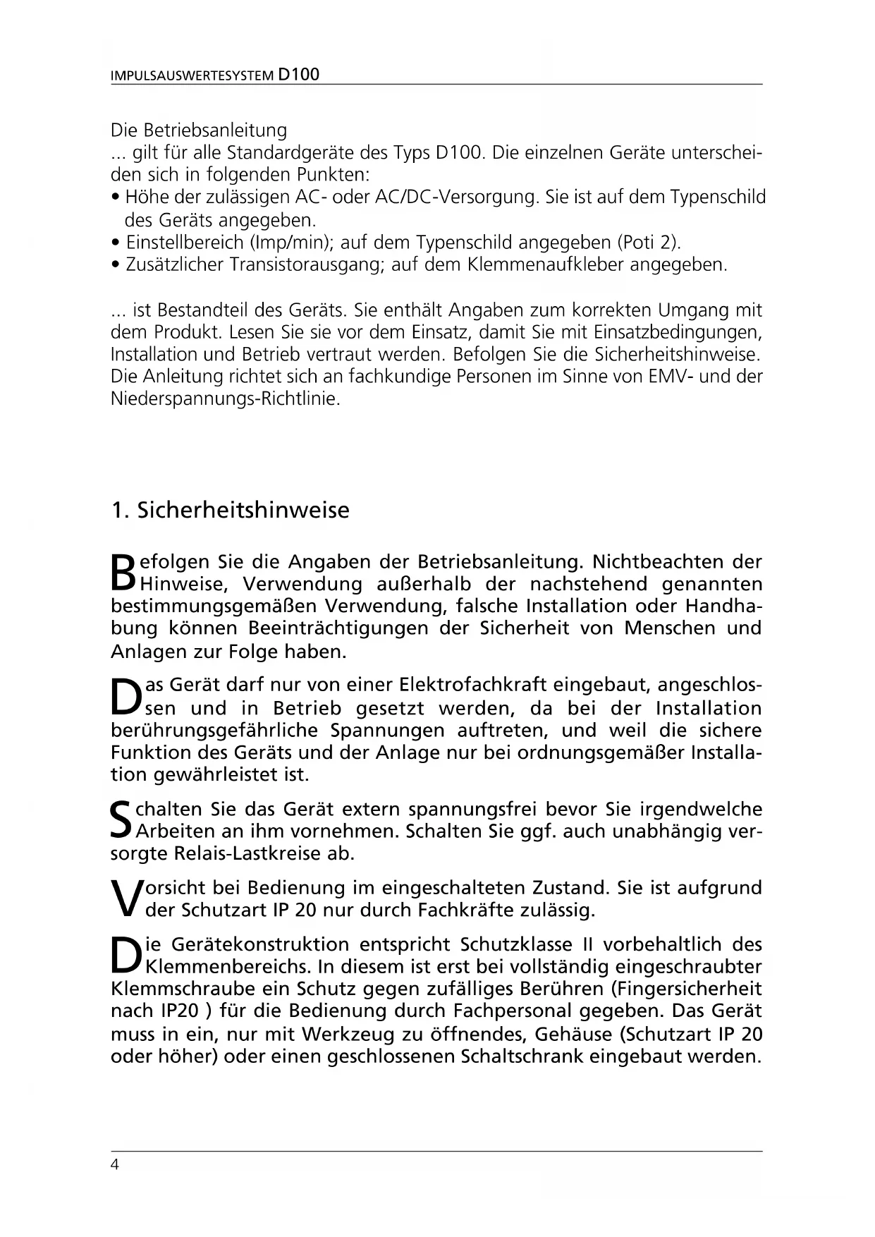 DEUTSCH IMPULSAUSWERTESYSTEM D100 Spannungsversorgung (alternativ AC oder DC) DC-Versorgung bei allen Geräten: 24 Volt DC ± 10%, an den Klemmen 6 (-) und 7(+); Es muss eine den Kriterien für SELV genügende externe DC-Spannung zugeführt werden. Das Gerät ist bei dieser Versorgungsart der Schutzklasse 3 zuzuordnen. Stromaufnahme ca. 70 mA. AC Geräte mit transformatorischem Netzteil: AC-Spannung gemäß Typenschild ± 10% an den Klemmen 15 (L1) und 16 (N), Frequenzbereich 50 ... 60 Hz. Das Gerät ist in dieser Versorgungsart vorbehaltlich des Klemmenbereichs der Schutzklasse 2 zuzuordnen. Die intern generierte Schutzkleinspannung zum Gerätebetrieb und zur Geberspei- sung entspricht den Kriterien für SELV im Rahmen der Überspannungskategorie 2 und des Ver- schmutzungsgrad 2. Leistungsaufnahme ca. 5 VA. Versorgung bei Geräten mit AC/DC-Schaltnetzteil: AC- oder DC-Spannung gemäß Typenschild ± 10% an den Klemmen 15 und 16, AC-Frequenzbereich 50 ... 60 Hz. Das Gerät ist in dieser Versorgungsart vorbehaltlich des Klemmenbereichs der Schutzklasse 2 zuzuordnen. Die intern generierte Schutzkleinspannung zum Gerätebetrieb und zur Geberspei- sung entspricht den Kriterien für SELV im Rahmen der Überspannungskategorie 2 und des Ver- schmutzungsgrad 2. Leistungsaufnahme ca. 5 VA. Eingänge Klemme 4 für pnp-schaltende 24 V DC-Geber. Stromaufnahme: max. 10 mA. Schaltpunkt für pnp-Geber: ≥ 14 V EIN; < 7 V AUS. Die maximal erkennbare Eingangsfrequenz beträgt 250 Hz (entsprechend 15000 Imp/min). Geberspeisung Spannung:typ. 24V DC; Strombelastbarkeit: max. 30 mA, kurzschlussfest und überlastfest. Die entnehmbare Spannung ist bei externer DC-Versorgung des Geräts über die Klemmen 6 und 7 deckungsgleich zur angelegten DC-Spannung, abzüglich einer geringfügigen Spannung für die Kurzschlussfestigkeit. Bei externer Versorgung des Geräts über das transformatorische oder das Schaltnetzteil (Klem- men 15 und 16) spiegelt diese die gleichgerichtete, nicht stabilisierte Ausgangs-Gleichspan- nung des internen Transformators wieder und beträgt nominell 24 V. Ausgänge Ausgangsrelais: Schaltvermögen: max. 250V AC, 8 A. Der Strom ist extern durch geeignete Maßnahmen auf diese Werte zu begrenzen. Bei induktiven Lasten sind die Relais extern zu entstören. Die Relaiskontakte sind in bezug auf Versorgungsspannungen des Geräts, auf Geber und ggf. Kontakte des zweiten Relais sicher getrennt bis zu einer Bemessungsspannung von 250V AC; sie entsprechen Überspannungskategorie 2 und Verschmutzungsgrad 2. ACHTUNG: Wird das Relais zum Schalten sehr kleiner Ströme benutzt (z. B. SPS Eingänge), können erhebliche Übergangswiderstände auftreten. Die Lebensdauer der Relaiskontakte wird durch Überströme oder Schalten ungeschützter induktiver Lasten erheblich reduziert.14 IMPULSAUSWERTESYSTEM D100 Transistorausgang (D100 mit AC/DC-Schaltnetzteil) Plusgeschaltet, 24 V DC (± 20%), 200 mA; externe Speisung an Klemme 9. Spannung wird kurzschlussfest funktionsabhängig geschaltet nach Klemme 10 Keine Rückspeisung der externen Spannung an Klemme 11. Gerätedaten Abmessungen: 75 x 55 x 110 (H x B x T), Gewicht: max. 400g Schutzart Gehäuse: IP 40, Schutzart Klemmen IP 20 Anschluss: 16 Klemmen, Adernquerschnitt: max: 2,5mm