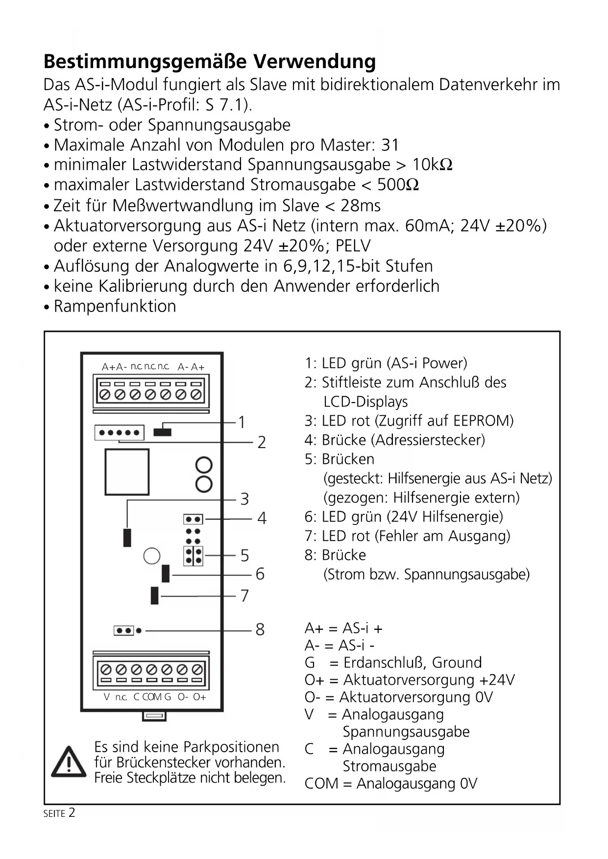 n.c. A + A - A - A + n.c. n.c. n.c. 1: LED grün (AS-i Power) 2: Stiftleiste zum Anschluß des LCD-Displays 3: LED rot (Zugriff auf EEPROM) 4: Brücke (Adressierstecker) 5: Brücken (gesteckt: Hilfsenergie aus AS-i Netz) (gezogen: Hilfsenergie extern) 6: LED grün (24V Hilfsenergie) 7: LED rot (Fehler am Ausgang) 8: Brücke (Strom bzw. Spannungsausgabe) A+ = AS-i + A- = AS-i - G = Erdanschluß, Ground O+ = Aktuatorversorgung +24V O- = Aktuatorversorgung 0V V = Analogausgang Spannungsausgabe C = Analogausgang Stromausgabe COM = Analogausgang 0V Es sind keine Parkpositionen für Brückenstecker vorhanden. Freie Steckplätze nicht belegen.SEITE 3 Montage Klemmen Sie das Modul auf eine 35mm-Profilschiene oder befestigen Sie es auf einer Montageunterlage (Zubehörteile erforderlich E70119). Elektrischer Anschluß Der Aktuator muß grundsätzlich erdfrei sein! Wird ein externes Potential verwendet, muß die Spannung nach PELV sein. Die Potentialtrennung zum AS-i - System ist für 500V ausgelegt. Brücken dürfen nur in spannungslosem Zustand gesteckt bzw. gezogen werden. Spannungsausgabe Parametereinstellung: P0 = 1: Spannungsausgabe P1 = 1: Meßbereich 0 ... 10V, Auflösung 0,3mV oder P1 = 0: Meßbereich 0 ... 10V, Auflösung 1mV Versorgung über AS-i Versorgung extern