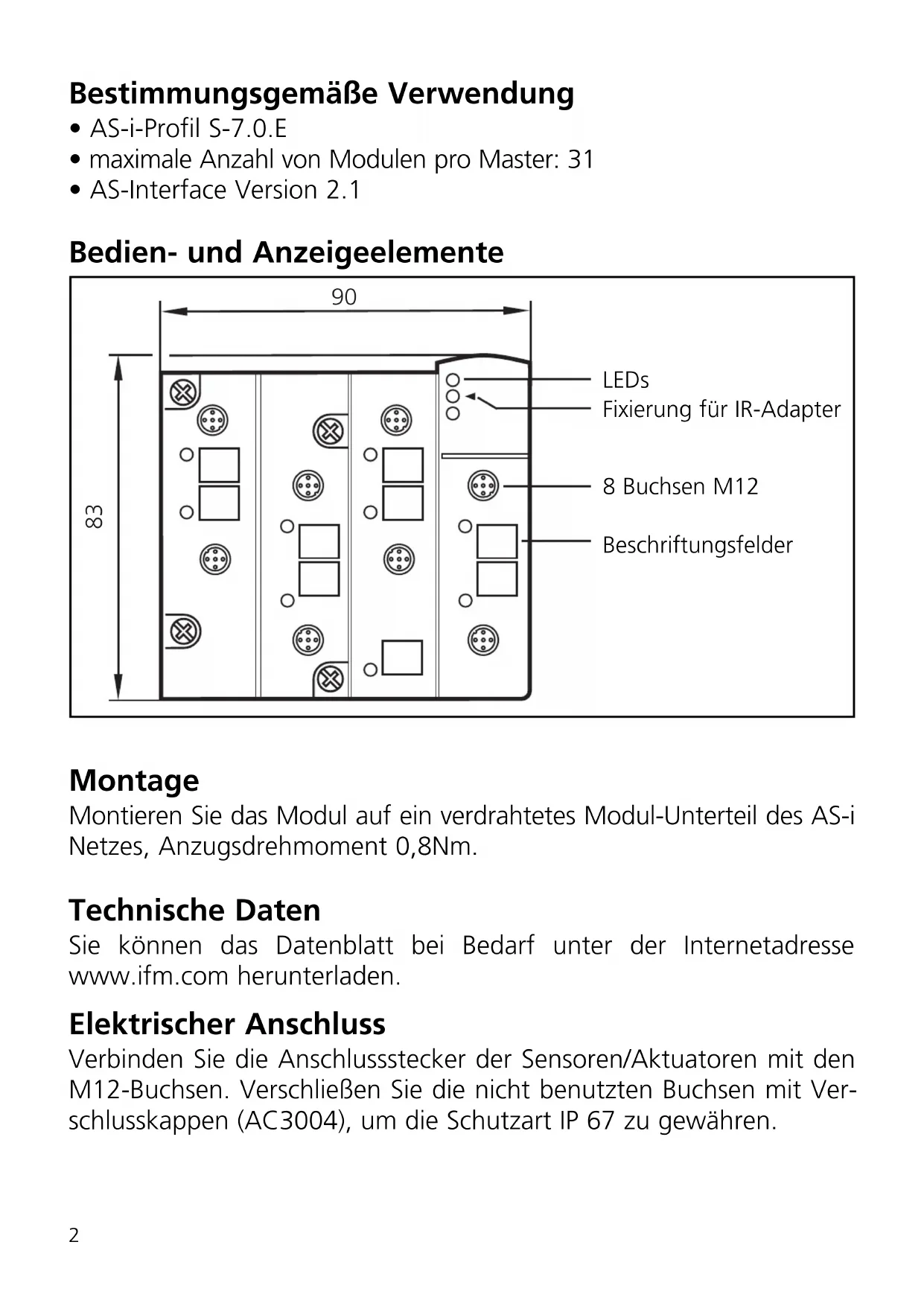- AS-Interface Version 2.1 Bedien- und Anzeigeelemente Montage Montieren Sie das Modul auf ein verdrahtetes Modul-Unterteil des AS-i Netzes, Anzugsdrehmoment 0,8Nm. Technische Daten Sie können das Datenblatt bei Bedarf unter der Internetadresse www.ifm.com herunterladen. Elektrischer Anschluss Verbinden Sie die Anschlussstecker der Sensoren/Aktuatoren mit den M12-Buchsen. Verschließen Sie die nicht benutzten Buchsen mit Ver- schlusskappen (AC3004), um die Schutzart IP 67 zu gewähren.