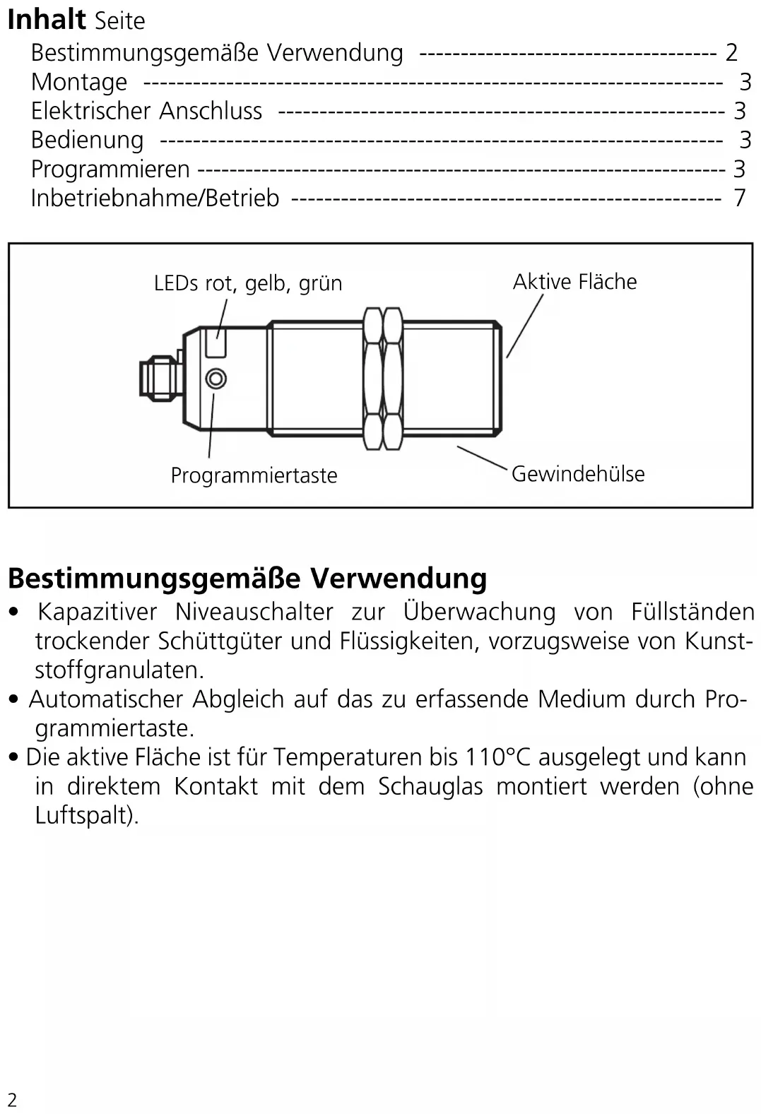- Die aktive Fläche ist für Temperaturen bis 110°C ausgelegt und kann in direktem Kontakt mit dem Schauglas montiert werden (ohne Luftspalt). Programmiertaste LEDs rot, gelb, grün Aktive Fläche GewindehülseMontage Montieren Sie den Niveauschalter wie abgebildet: Elektrischer Anschluss Schalten Sie die Anlage span- nungsfrei. Schließen Sie das Gerät an (siehe Typenschild). Bedienung Gleichen Sie den Sensor ab. Drücken Sie dazu die Program- miertaste mit einem stumpfen Gegenstand. Programmieren Übersicht über die Modi und ihre Grundfunktionen: