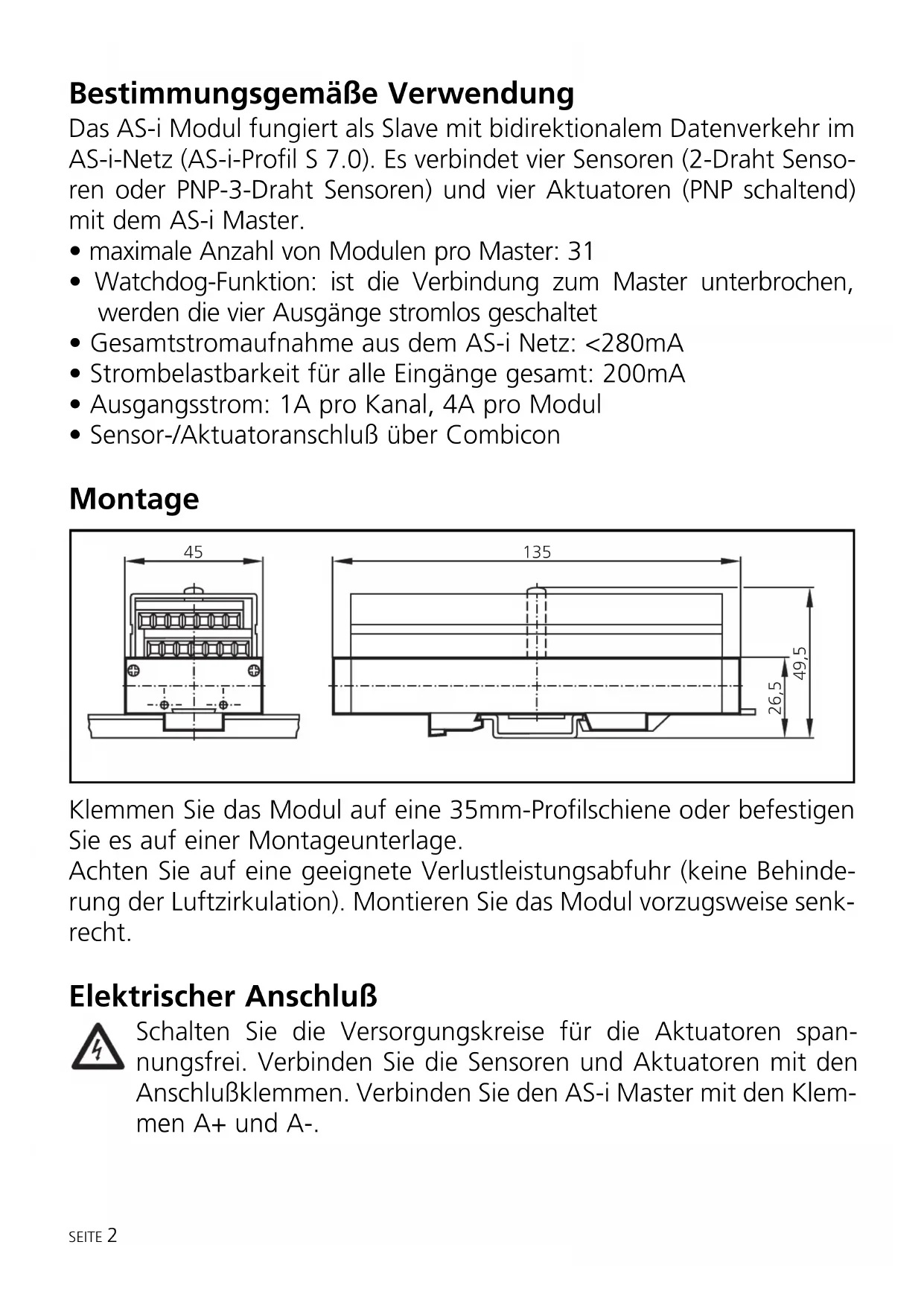 - Sensor-/Aktuatoranschluß über Combicon Montage Klemmen Sie das Modul auf eine 35mm-Profilschiene oder befestigen Sie es auf einer Montageunterlage. Achten Sie auf eine geeignete Verlustleistungsabfuhr (keine Behinde- rung der Luftzirkulation). Montieren Sie das Modul vorzugsweise senk- recht. Elektrischer Anschluß Schalten Sie die Versorgungskreise für die Aktuatoren span- nungsfrei. Verbinden Sie die Sensoren und Aktuatoren mit den Anschlußklemmen. Verbinden Sie den AS-i Master mit den Klem- men A+ und A-. SEITE 2