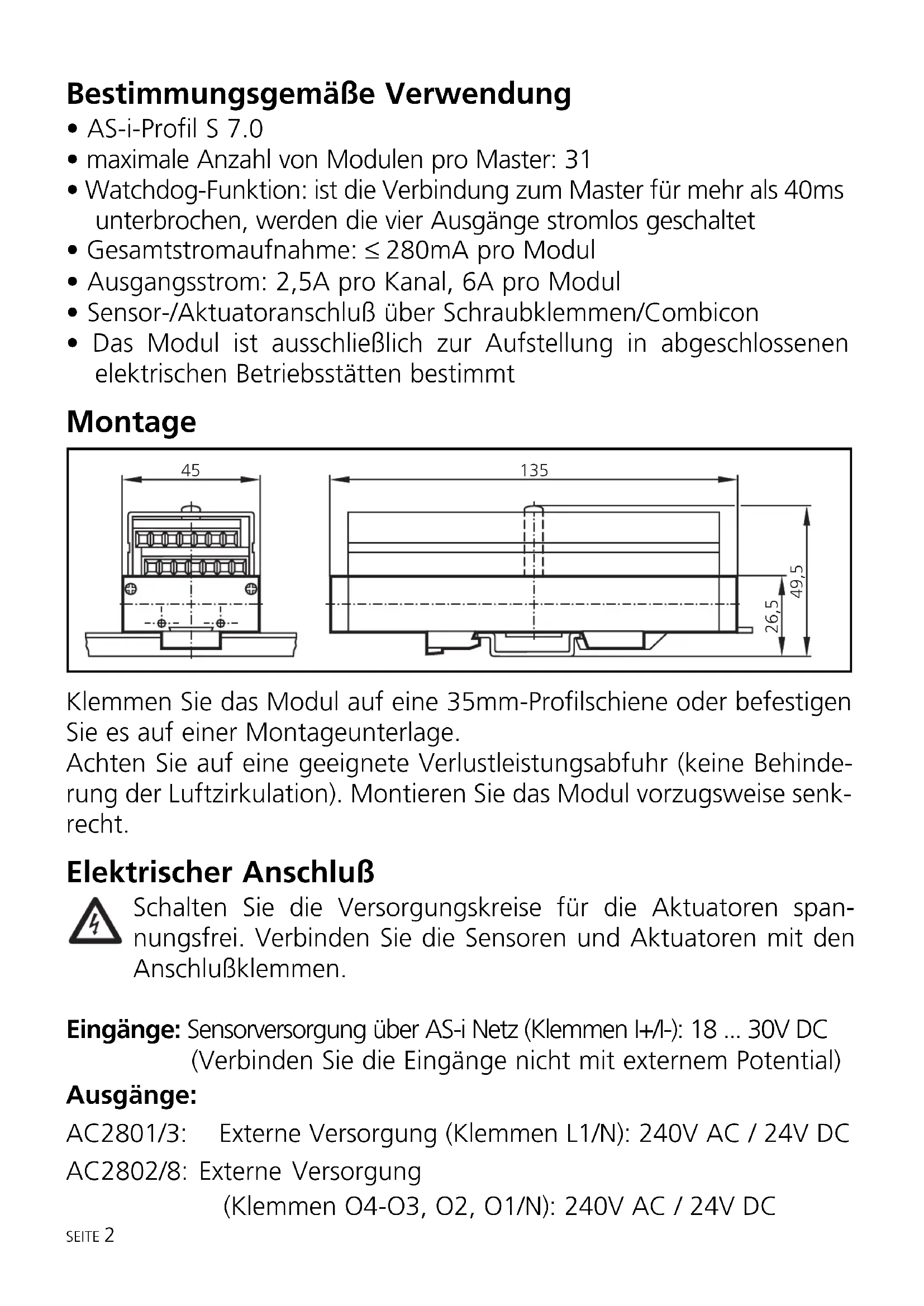 - Das Modul ist ausschließlich zur Aufstellung in abgeschlossenen elektrischen Betriebsstätten bestimmt Montage Klemmen Sie das Modul auf eine 35mm-Profilschiene oder befestigen Sie es auf einer Montageunterlage. Achten Sie auf eine geeignete Verlustleistungsabfuhr (keine Behinde- rung der Luftzirkulation). Montieren Sie das Modul vorzugsweise senk- recht. Elektrischer Anschluß Schalten Sie die Versorgungskreise für die Aktuatoren span- nungsfrei. Verbinden Sie die Sensoren und Aktuatoren mit den Anschlußklemmen. Eingänge: Sensorversorgung über AS-i Netz (Klemmen I+/I-): 18 ... 30V DC (Verbinden Sie die Eingänge nicht mit externem Potential) Ausgänge: AC2801/3: Externe Versorgung (Klemmen L1/N): 240V AC / 24V DC AC2802/8: Externe Versorgung (Klemmen O4-O3, O2, O1/N): 240V AC / 24V DC SEITE 2