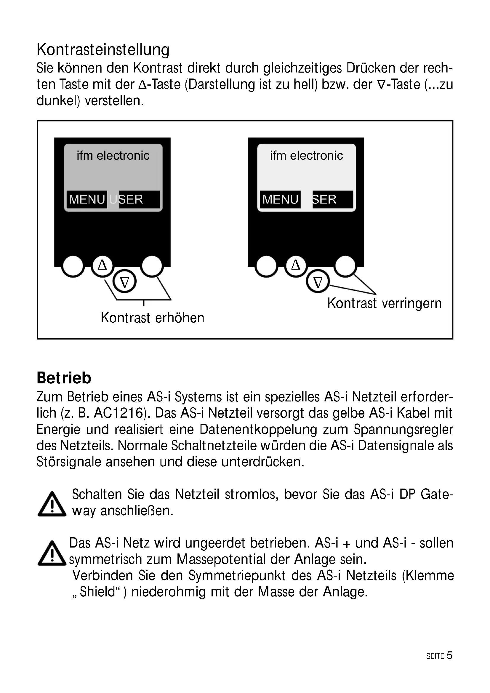 ifm electronic MENU USER Kontrast erhöhen Kontrast verringernMenü-Übersicht Menü-Navigation O Slave Lists (Prüfen der Adressen der angeschlossenen AS-i Slaves) ∇ Liste der detektierten AS-i Slaves (LDS) ∇ Liste der projektierten AS-i Slaves (LPS) ∇ Liste der aktivierten AS-i Slaves (LAS) ∇ Liste der AS-i Slaves mit Peripheriefehler (LPF) O Address Slave (Programmierung der korrekten Adressen in den angeschlossenen AS-i Slaves) ∇ Umadressieren eines am Gateway angeschlos- senen AS-i Slaves ∇ Automatisches adressieren neuer AS-i Slaves auf die nächste freie Adresse (Easy Startup) O Quick Setup (Zusammenfassung der für eine Grundkonfiguration erforderlichen Menüpunkte) ∇ Die aktuelle AS-i Konfiguration einlesen (Config all) ∇ Einstellung der Feldbusverbindung SEITE 6