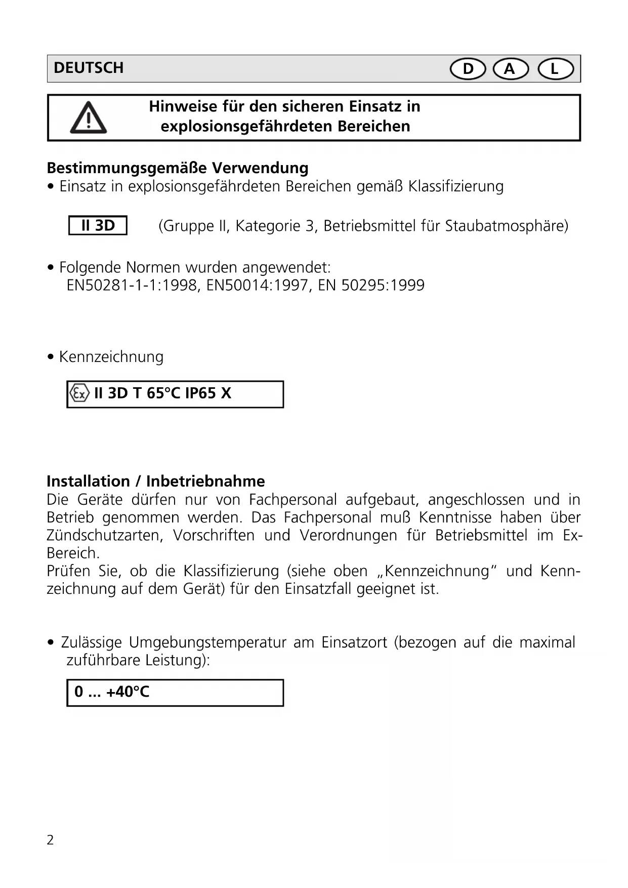 Hinweise für den sicheren Einsatz in explosionsgefährdeten Bereichen II 3D II 3D T 65°C IP65 X 0 ... +40°C LAD DEUTSCHEinbauhinweise / Montage