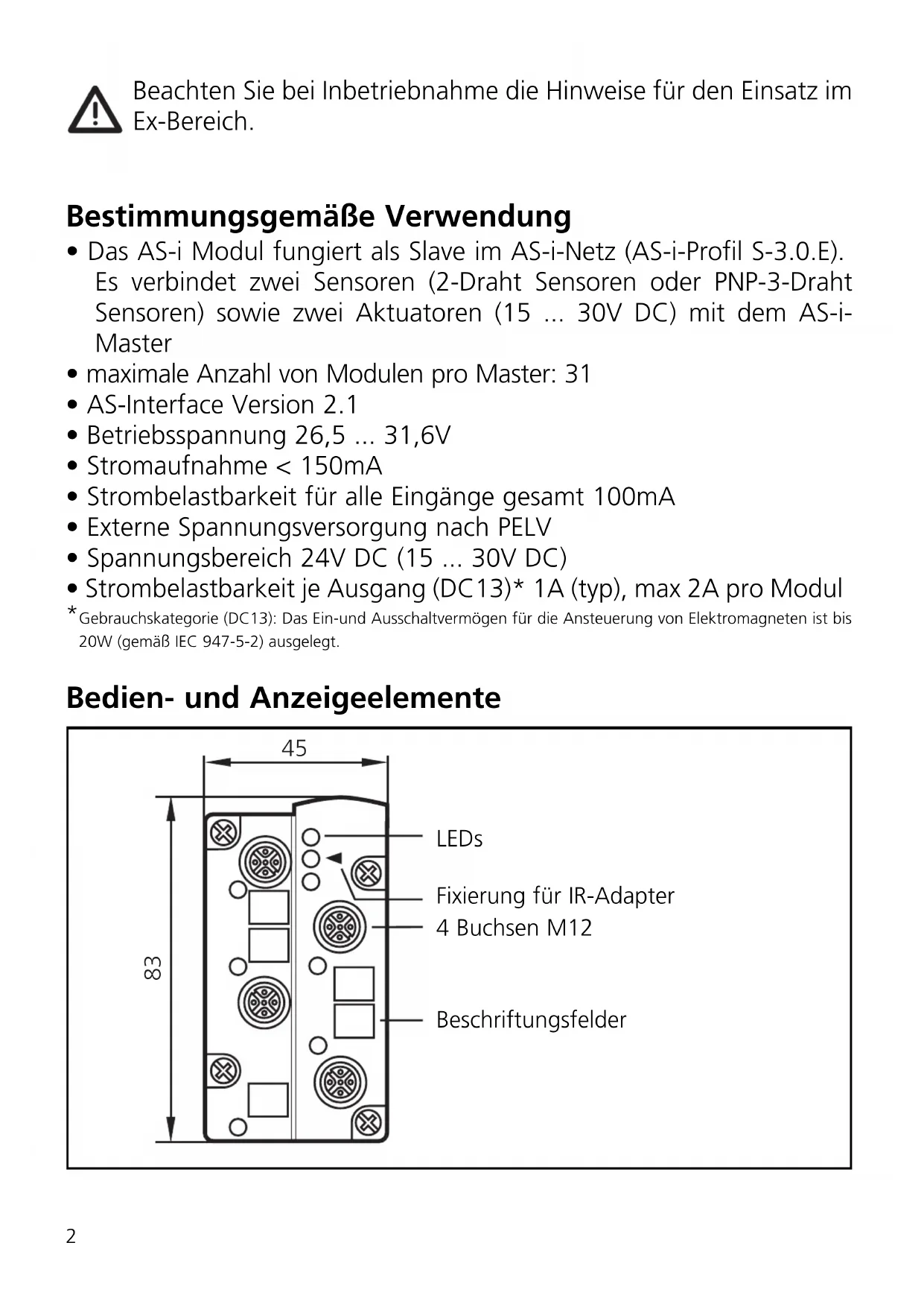 - LED 3: Infrarot-Empfänger Überlast und Kurzschluß von Ein- und Ausgang wird dem AS-i Master (Version 2.1) über das Flag „Periphery Fault“ im Status- register signalisiert. 4For installation and set-up follow the instructions on the use in hazardous areas. Function and features