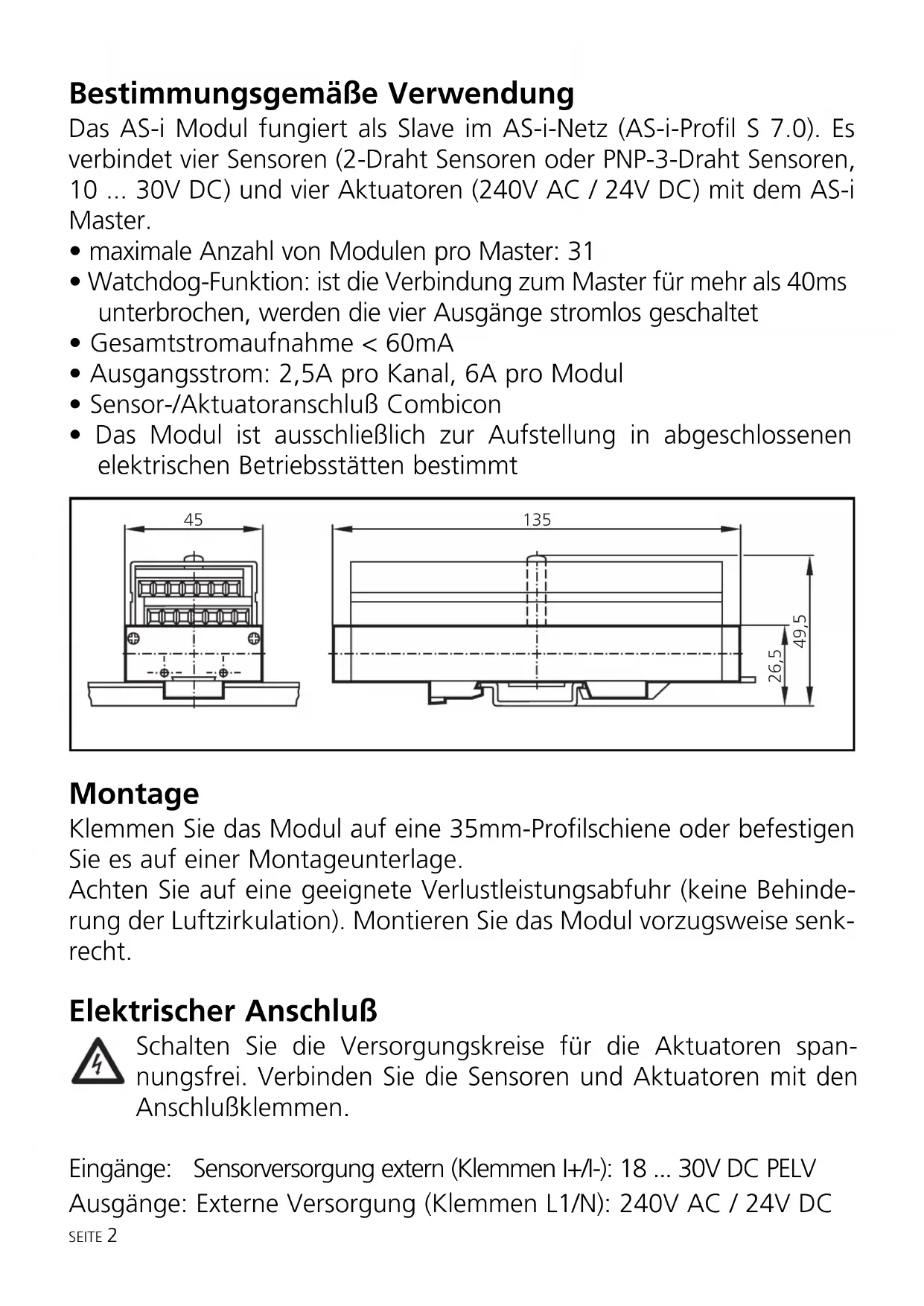 - Das Modul ist ausschließlich zur Aufstellung in abgeschlossenen elektrischen Betriebsstätten bestimmt Montage Klemmen Sie das Modul auf eine 35mm-Profilschiene oder befestigen Sie es auf einer Montageunterlage. Achten Sie auf eine geeignete Verlustleistungsabfuhr (keine Behinde- rung der Luftzirkulation). Montieren Sie das Modul vorzugsweise senk- recht. Elektrischer Anschluß Schalten Sie die Versorgungskreise für die Aktuatoren span- nungsfrei. Verbinden Sie die Sensoren und Aktuatoren mit den Anschlußklemmen. Eingänge: Sensorversorgung extern (Klemmen I+/I-): 18 ... 30V DC PELV Ausgänge: Externe Versorgung (Klemmen L1/N): 240V AC / 24V DC SEITE 2