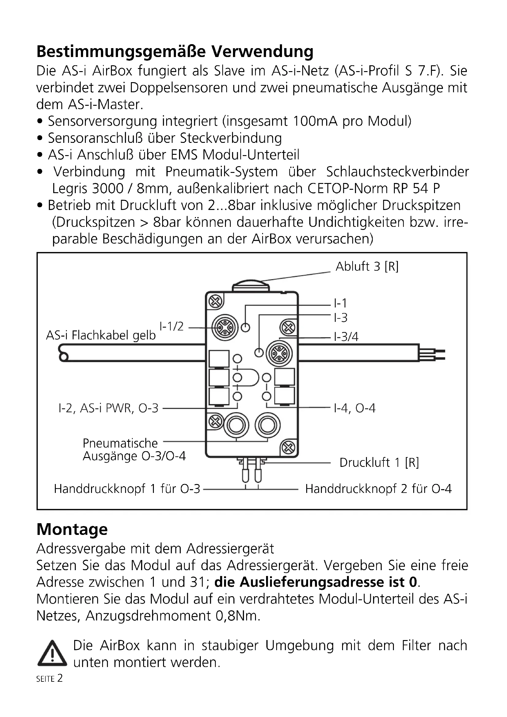 - Betrieb mit Druckluft von 2...8bar inklusive möglicher Druckspitzen (Druckspitzen > 8bar können dauerhafte Undichtigkeiten bzw. irre- parable Beschädigungen an der AirBox verursachen) Montage Adressvergabe mit dem Adressiergerät Setzen Sie das Modul auf das Adressiergerät. Vergeben Sie eine freie Adresse zwischen 1 und 31; die Auslieferungsadresse ist 0. Montieren Sie das Modul auf ein verdrahtetes Modul-Unterteil des AS-i Netzes, Anzugsdrehmoment 0,8Nm. Die AirBox kann in staubiger Umgebung mit dem Filter nach unten montiert werden. SEITE 2 I-1/2 I-3/4 I-1 I-3 I-4, O-4 I-2, AS-i PWR, O-3 Abluft 3 [R] Druckluft 1 [R] Pneumatische Ausgänge O-3/O-4 Handdruckknopf 1 für O-3 Handdruckknopf 2 für O-4 AS-i Flachkabel gelbSEITE 3 Druckluft Befolgen Sie die Sicherheitsbestimmungen und Vorschriften für die Einrichtung pneumatischer Anlagen. Schalten Sie die Anlage druckfrei. Verbinden Sie die Anschlüsse für Druckluftzufuhr 1 (P), pneumatische Ausgänge (O-3, O-4) und gegebenenfalls die Abluft 3 (R) mit dem pneumatischen System. Schneiden Sie den Anschlußschlauch gerade ab und schieben Sie ihn in die Steckverbindung, bis er hörbar einrastet. Abziehen der Schläuche Zum Lösen drücken Sie auf den schwarzen Ring und ziehen gleichzei- tig den Schlauch heraus. Mit den Handdruckknöpfen können Sie die pneumatischen Ausgänge in Betrieb setzen. Lassen Sie Druckluft in die AS-i AirBox strömen. Wenn Sie dann Handdruckknopf 1 drücken, wird der Ausgang O-3 angesteuert. Drücken Sie Handdruckknopf 2, wird der Ausgang O-4 angesteuert. Elektromagnetische Verträglichkeit (EMV) Die AirBox ist ausgelegt für den Betrieb in industrieller Umgebung. Die Prüfung der elektrostatischen Entladung wurde gemäß der EN 61000-4-2 mit folgenden Prüfpegeln festgelegt: