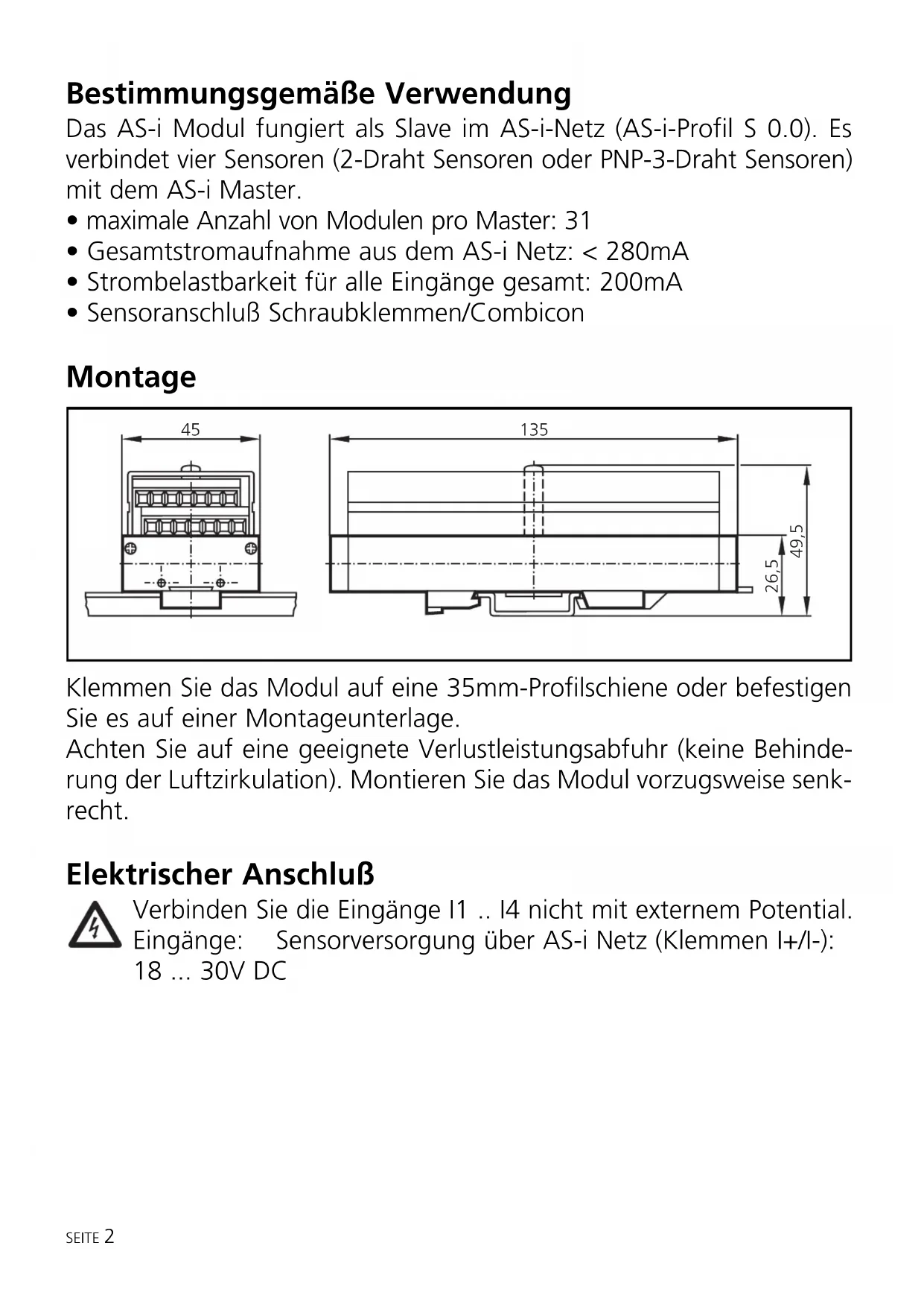 - Sensoranschluß Schraubklemmen/Combicon Montage Klemmen Sie das Modul auf eine 35mm-Profilschiene oder befestigen Sie es auf einer Montageunterlage. Achten Sie auf eine geeignete Verlustleistungsabfuhr (keine Behinde- rung der Luftzirkulation). Montieren Sie das Modul vorzugsweise senk- recht. Elektrischer Anschluß Verbinden Sie die Eingänge I1 .. I4 nicht mit externem Potential. Eingänge: Sensorversorgung über AS-i Netz (Klemmen I+/I-): 18 ... 30V DC SEITE 2