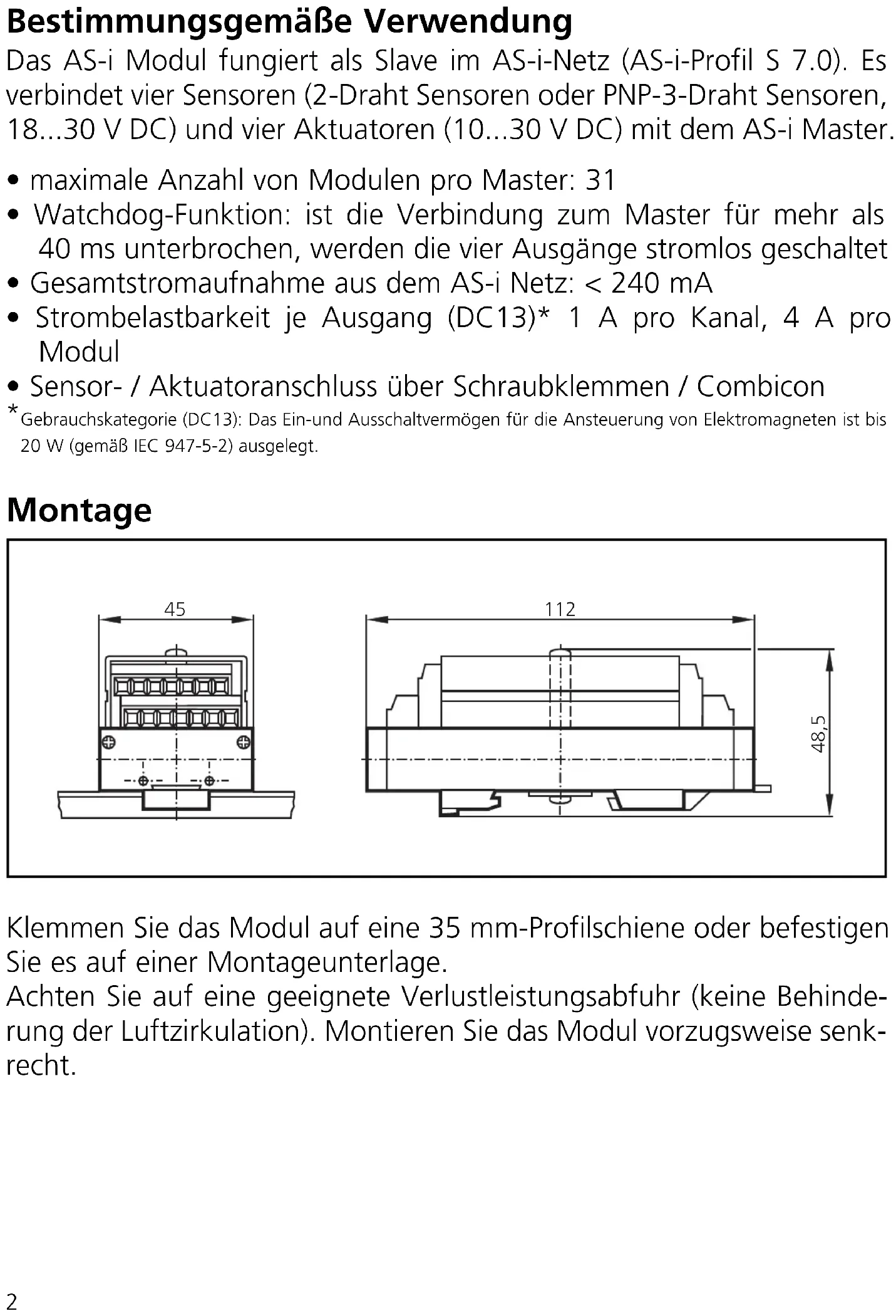 Gebrauchskategorie (DC13): Das Ein-und Ausschaltvermögen für die Ansteuerung von Elektromagneten ist bis20 W (gemäß IEC 947-5-2) ausgelegt. Montage Klemmen Sie das Modul auf eine 35 mm-Profilschiene oder befestigen Sie es auf einer Montageunterlage. Achten Sie auf eine geeignete Verlustleistungsabfuhr (keine Behinde- rung der Luftzirkulation). Montieren Sie das Modul vorzugsweise senk- recht.