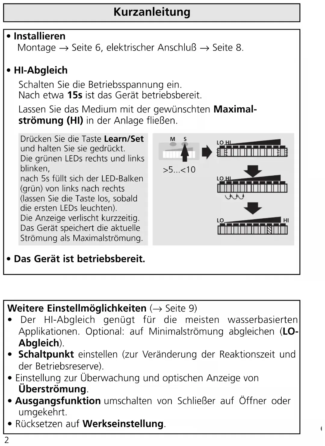 - >10...<15s lang Taste Learn/Set drücken (= Abgleich auf Minimalströmung oder Strömungsstillstand / unteres Ende des Über-wachungsbereichs).