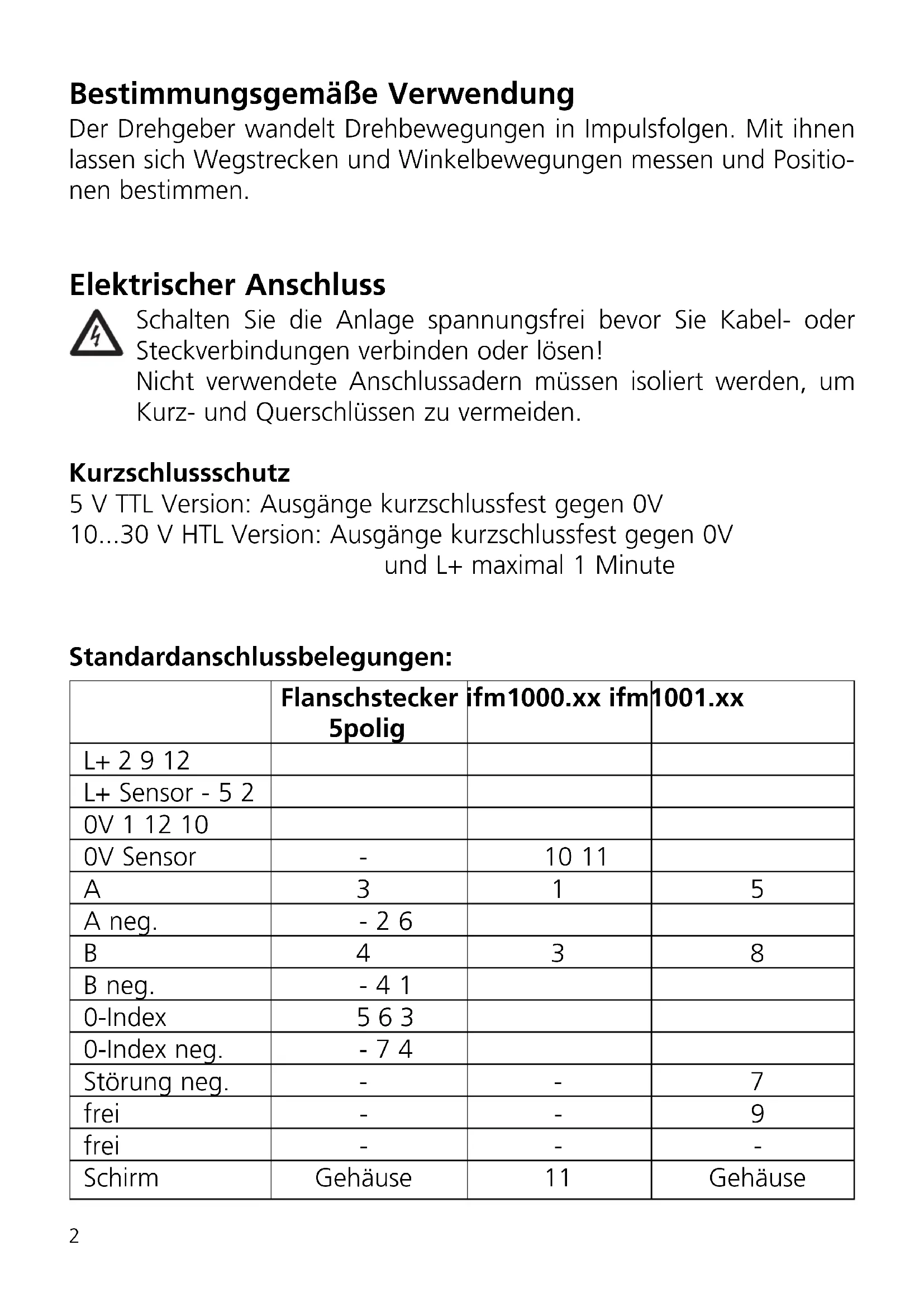 Flanschstecker ifm1000.xx ifm1001.xx 5polig L+ 2 9 12 L+ Sensor - 5 2 0V 1 12 10 0V Sensor - 10 11 A315 A neg. - 2 6 B438 B neg. - 4 1 0-Index 5 6 3 0-Index neg. - 7 4 Störung neg. - - 7 frei - - 9 frei - - - Schirm Gehäuse 11 GehäuseDie Anschlussbelegung finden Sie zusätzlich auf der Gehäusekappe. Bei Abweichungen muss der Anschluss gemäß des Aufklebers auf der Gehäusekappe vorgenommen werden. Die Anschlüsse L+ (Sensor) und 0V (Sensor) sind intern mit der Versor- gungsspannung verbunden. Bei Verwendung von Folgeelektroniken, die die Versorgungsspannung nachregeln, können diese Anschlüsse als Prüfleitungen verwendet werden. Bei Nichtverwendung sind diese Anschlüsse mit der Versorgungsspannung zu verbinden oder zu isolie- ren. Der elektrische Anschluss erfolgt je nach Ausführung über die Anschlussleitung oder separat erhältlichen Anschlussleitungen. Bei Verwendung von geeigneten Verbindungsleitungen beträgt die maximale Leitungslänge für die 5 V TTL Version 100 m und für die 10...30 V HTL Version 300 m.