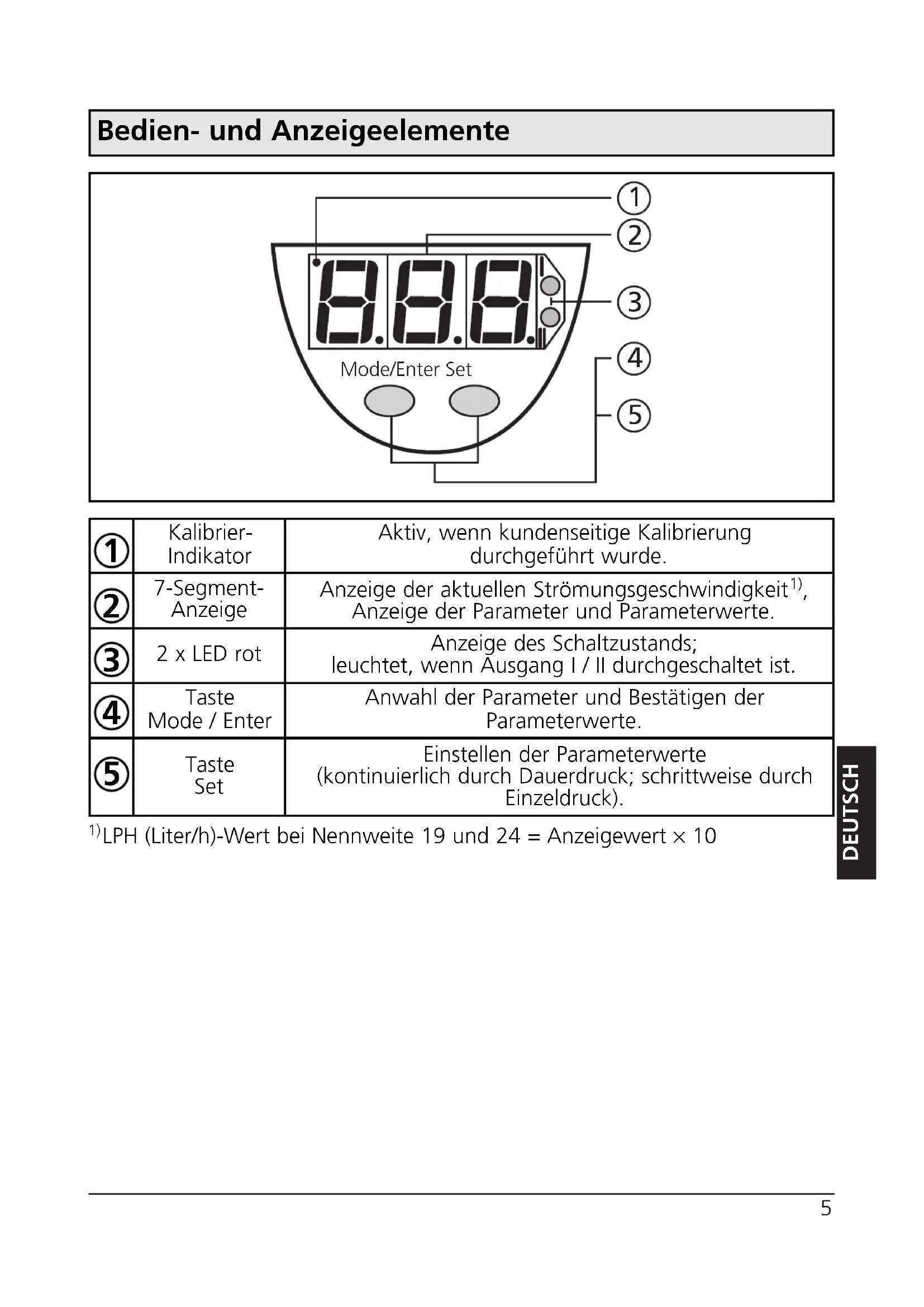 - Lo: Anzeige der niedrigsten gemessenen Strömung Löschen des Speichers: - Drücken Sie die “Mode/Enter”-Taste, bis HI oder Lo erscheint. - Drücken Sie die “Set”-Taste und halten Sie sie fest, bis die Anzeige “- - -” erscheint. - Drücken Sie dann kurz die “Mode/Enter”-Taste. Es ist sinnvoll, die Speicher zu löschen, sobald das Gerät erstmals unter normalen Betriebsbedingungen arbeitet. Kundenseitige Kalibrierung (Erläuterung → Seite 18) Wenn Sie die Funktion aktivieren, erscheint der aktuelle Strömungswert in der Anzeige. - Stellen Sie mit der SET-Taste den gewünschten neuen Wert ein (kontinuierlich durch Dauerdruck; schrittweise durch Einzeldruck). - Bestätigen Sie kurz mit der Mode/Enter-Taste. Nach der Kalibrierung erscheint ein Kalibrier-Indikator links oben im Display. Die Kalibrierung ist erst möglich ab Werten > 25% des Meßbereichsendwerts. Bei kleineren Werten erscheint Lo in der Anzeige, die Einstellung des Parameters ist gesperrt. Einstellbereich: aktueller Strömungswert ±40%; max. Anzeige: Meßbereichsendwert + 20%. Rücksetzen der Kalibrierung - Drücken Sie die “Mode/Enter”-Taste, bis CAr erscheint. - Drücken Sie die “Set”-Taste und halten Sie sie fest, bis die Anzeige “- - -” erscheint. - Drücken Sie dann kurz die “Mode/Enter”-Taste. Die mit CGA eingestellte Kalibrierung ist zurückgesetzt; der Kalibrier-Indikator verlischt.15 DEUTSCH Anlaufüberbrückungszeit Während dieser Zeit gelten besondere Bedingungen für das Schalten der Ausgänge (Erläuterung → Seite 19).