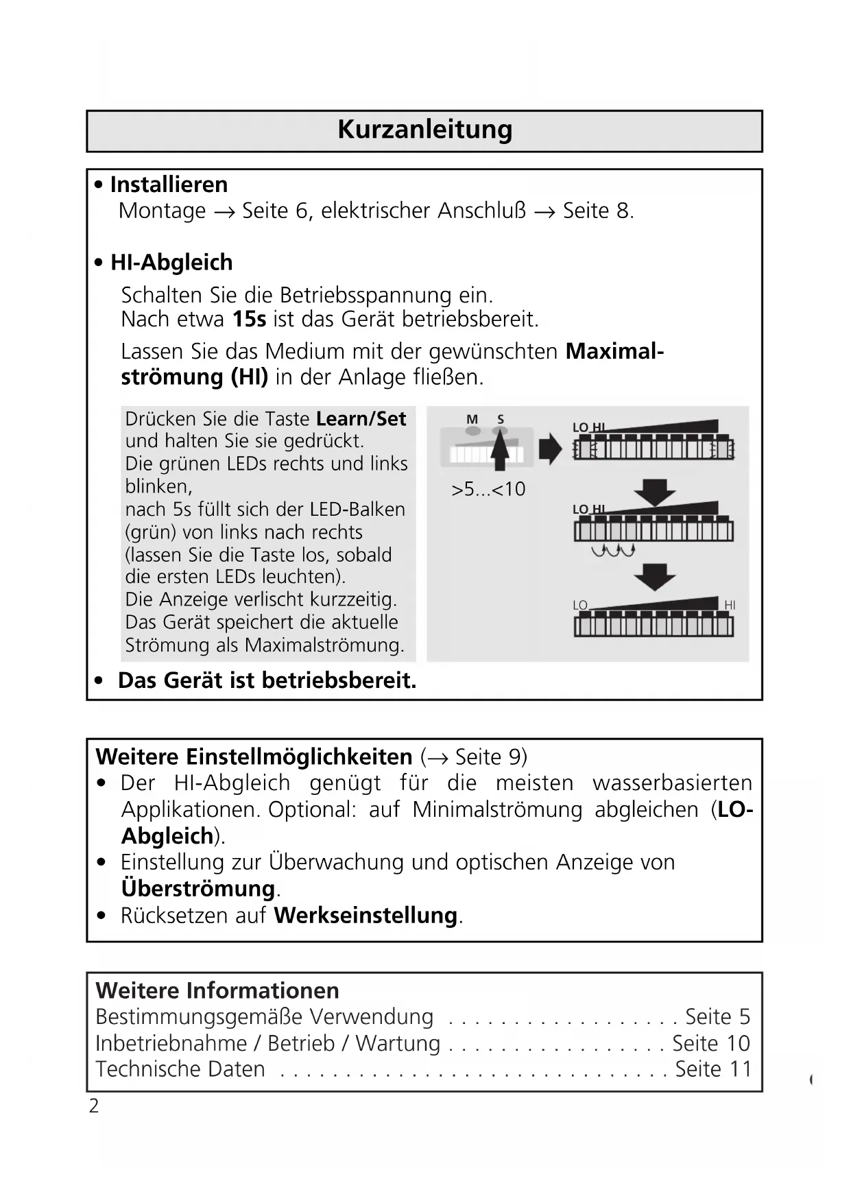 - >5...<10s lang Taste Learn/Set drücken (= Abgleich auf Maximalströmung / oberes Ende des Überwachungsbereichs). Optional: LO-Abgleich Der HI-Abgleich genügt für die meisten wasserbasierten Applikationen. Zusätzlich können Sie das Gerät in einem zweiten Schritt auf Minimalströmung abgleichen: