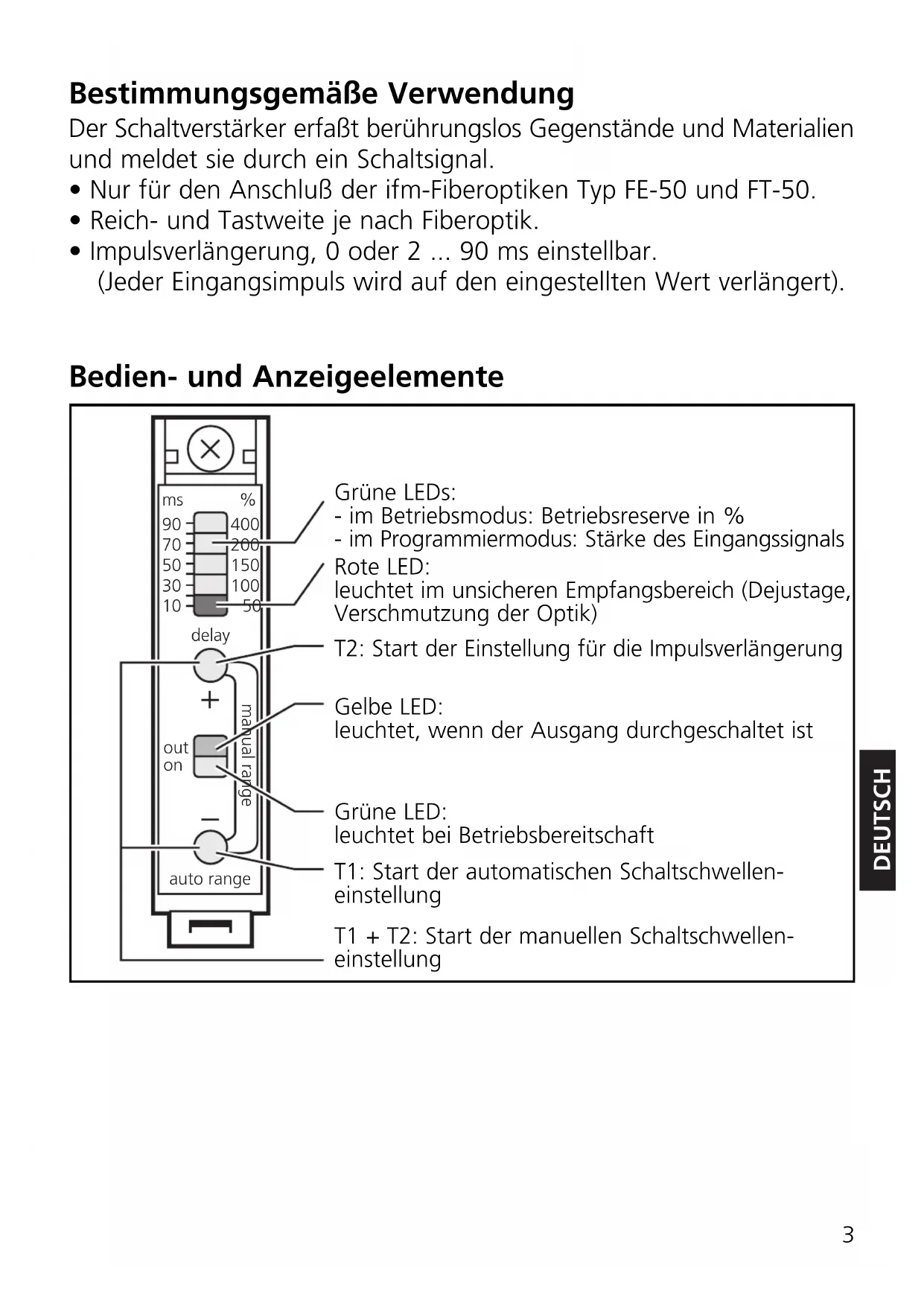 Sachnr. 701688/00 01/2002 DEUTSCH ENGLISHFRANÇAISDeutsch Bestimmungsgemäße Verwendung 3 Bedien- und Anzeigeelemente 3 Montage 4 Adaptieren der Lichtleiter 4 Elektrischer Anschluß 4 Schaltschwelle automatisch einstellen (1) 5 Schaltschwelle automatisch einstellen (2) 6 Schaltschwelle manuell einstellen (1) 7 Schaltschwelle manuell einstellen (2) 8 Einstellen der Impulsverlängerung 9 Betrieb 9 English Intended use 10 Controls and indicators 10 Mounting 11 Mount the fibre optics 11 Electrical connection 11 Automatic setting of the switching threshold (1) 12 Automatic setting of the switching threshold (2) 13 Manual setting of the switching threshold (1) 14 Manual setting of the switching threshold (2) 15 Adjust of the pulse stretching 16 Operation 16 Français Fonctionnement et caractéristiques 17 Eléments de service et d’indication 17 Montage 18 Monter les fibres optiques 18 Raccordement électrique 18 Réglage automatique du seuil de commutation (1) 19 Réglage automatique du seuil de commutation (2) 20 Réglage manuel du seuil de commutation (1) 21 Réglage manuel du seuil de commutation (2) 22 Régler la prolongation d’impulsion 23 Fonctionnement 23 2DEUTSCH Bestimmungsgemäße Verwendung Der Schaltverstärker erfaßt berührungslos Gegenstände und Materialien und meldet sie durch ein Schaltsignal.