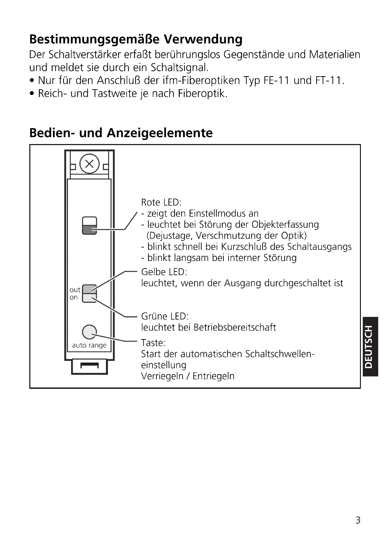 Sachnr. 701873/00 08/2004Deutsch Seite Bestimmungsgemäße Verwendung 3 Bedien- und Anzeigeelemente 3 Montage 4 Adaptieren der Lichtleiter 4 Elektrischer Anschluß 4 Schaltschwelle einstellen 5, 6 Einstellen maximaler Empfindlichkeit 6 Verriegeln / Entriegeln 7 Betrieb 7 Funktionskontroll-Ausgang 7 Anschluß 19 English Page Intended use 8 Controls and indicators 8 Mounting 9 Mount the fibre optics 9 Electrical connection 9 Setting of the switching threshold 10, 11 Setting of the maximum sensitivity 11 Locking / Unlocking 12 Operation 12 Function check output 12 Connection 19 Français Page Fonctionnement et caractéristiques 13 Eléments de service et d’indication 13 Montage 14 Monter les fibres optiques 14 Raccordement électrique 14 Réglage du seuil de commutation 15, 16 Réglage de la sensibilité maximale 17 Blocage / Déblocage 17 Fonctionnement 17 La sortie diagnostique 18 Raccordement 19 2DEUTSCH Bestimmungsgemäße Verwendung Der Schaltverstärker erfaßt berührungslos Gegenstände und Materialien und meldet sie durch ein Schaltsignal.