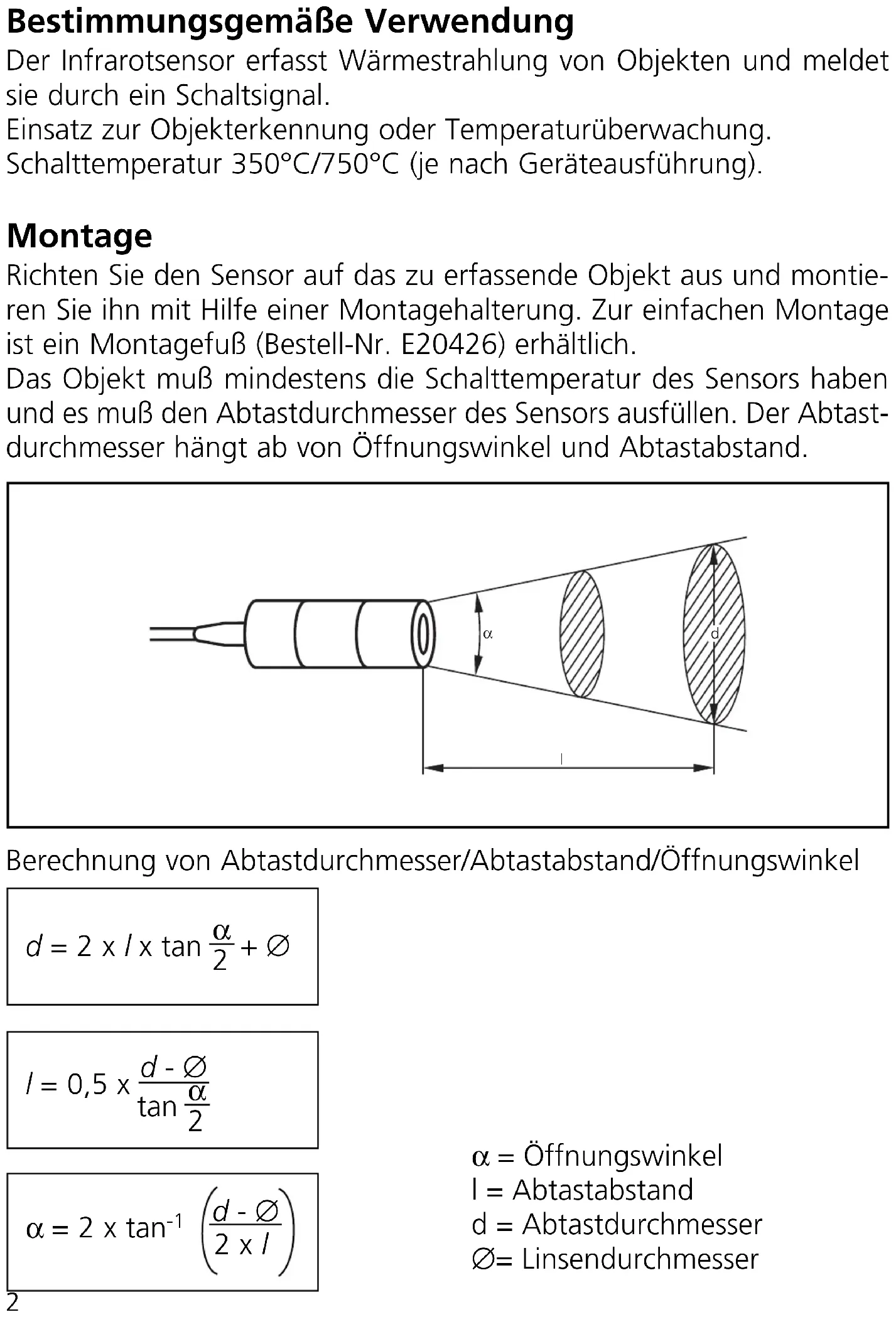 701345 / 02 09 / 2007Bestimmungsgemäße Verwendung Der Infrarotsensor erfasst Wärmestrahlung von Objekten und meldet sie durch ein Schaltsignal. Einsatz zur Objekterkennung oder Temperaturüberwachung. Schalttemperatur 350°C/750°C (je nach Geräteausführung). Montage Richten Sie den Sensor auf das zu erfassende Objekt aus und montie- ren Sie ihn mit Hilfe einer Montagehalterung. Zur einfachen Montage ist ein Montagefuß (Bestell-Nr. E20426) erhältlich. Das Objekt muß mindestens die Schalttemperatur des Sensors haben und es muß den Abtastdurchmesser des Sensors ausfüllen. Der Abtast- durchmesser hängt ab von Öffnungswinkel und Abtastabstand. Berechnung von Abtastdurchmesser/Abtastabstand/Öffnungswinkel