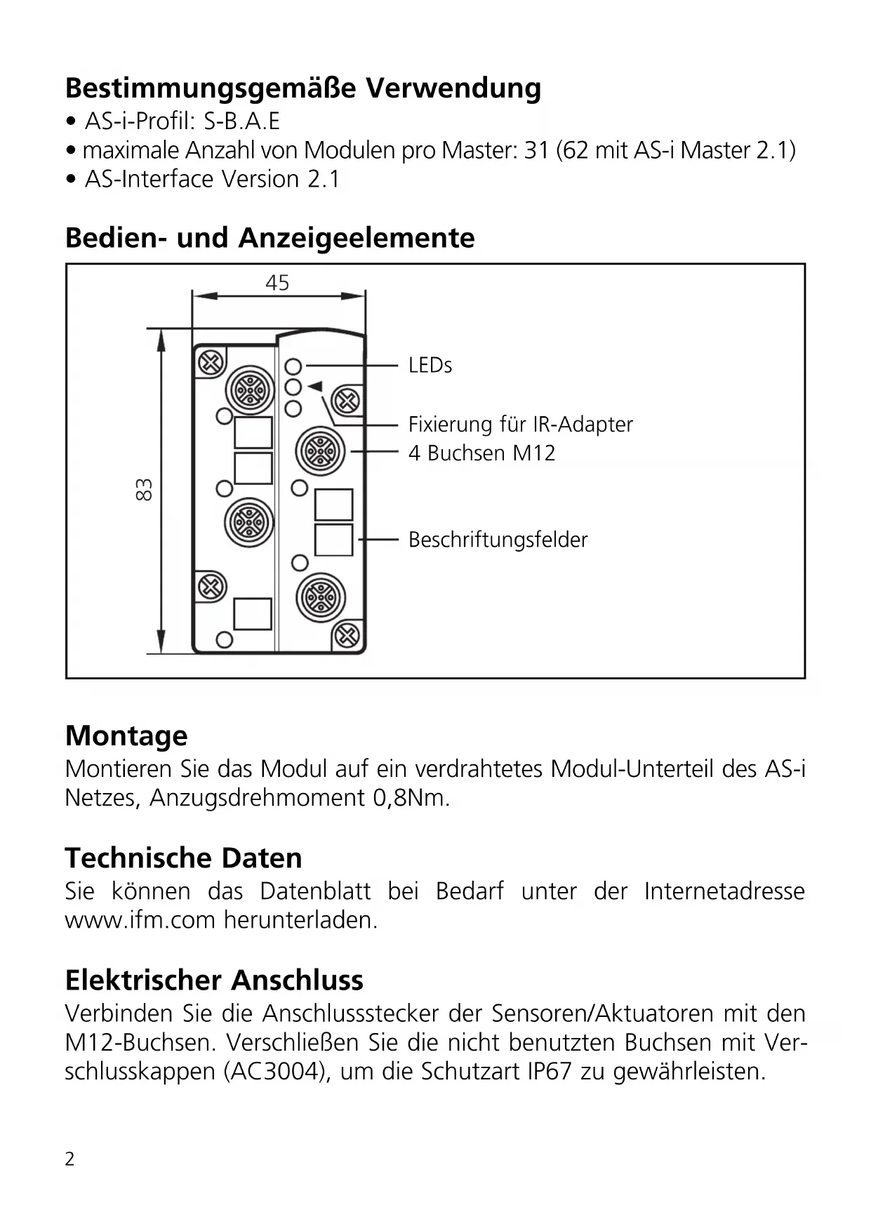 - AS-Interface Version 2.1 Bedien- und Anzeigeelemente Montage Montieren Sie das Modul auf ein verdrahtetes Modul-Unterteil des AS-i Netzes, Anzugsdrehmoment 0,8Nm. Technische Daten Sie können das Datenblatt bei Bedarf unter der Internetadresse www.ifm.com herunterladen. Elektrischer Anschluss Verbinden Sie die Anschlussstecker der Sensoren/Aktuatoren mit den M12-Buchsen. Verschließen Sie die nicht benutzten Buchsen mit Ver- schlusskappen (AC3004), um die Schutzart IP67 zu gewährleisten.