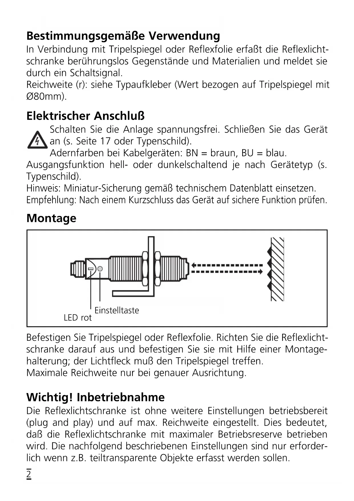 Drücken Sie 10s lang. Die rote LED beginnt nach 2s schnell zu blinken. Danach blinkt die LED ca. 8s lang- sam. Nach dem Verlöschen der LED ist das Gerät verriegelt. Drücken Sie 10s lang. Nach 10s erlischt die LED, die Verriegelung ist aufgehoben.Dunkelschaltende Geräte (Schließer) Das Gerät empfängt vom Tripelspiegel kein reflektiertes Licht → LED leuchtet, Ausgang geschaltet: Objekt erkannt (sicherer Bereich). Das Gerät empfängt sehr wenig vom Tripelspiegel reflektiertes Licht → LED blinkt (1 Hz), Ausgang geschaltet: Objekt erkannt (unsicherer Bereich). Das Gerät empfängt vom Tripelspiegel reflektiertes Licht → LED aus, Ausgang nicht geschaltet: kein Objekt erkannt. Wartung Halten Sie die Linsen des Geräts von Verschmutzungen frei. Verwenden Sie zur Reinigung keine Lösungsmittel oder Reiniger, die die Kunststofflinsen beschädigen könnten. 6ENGLISH Function and features In conjunction with a prismatic reflector or reflective tape the retro- reflective sensor detects objects and materials without contact and indicates their presence by a switched signal. Range (r): see type label (value referred to prismatic reflector with ∅ 80mm). Electrical connection Isolate power, then connect the unit (see page 17 or type label). Core colours: BN = brown, BU = blue. Output function light-on or dark-on mode depending on the unit (see type label). Note: insert a miniature fuse according to the technical data sheet. Recommendation: check the unit for reliable function after a short cirucit. Installation Fix prismatic reflector / reflective tape in desired position. Align the photocell photocell towards the reflector and fasten it to a mounting bracket; the light spot must hit the prismatic reflector. Maximum range is only possible with precise alignment. NB: Commissioning The retro-reflective sensor is supplied ready to operate (plug and play) set at the max. sensing range. This is sufficient if the retro-reflective sensor can operate with maximum excess gain (highest contrast). The following setting procedures should only be necessary in less straight- forward applications, for example if partly transparent objects must be detected.