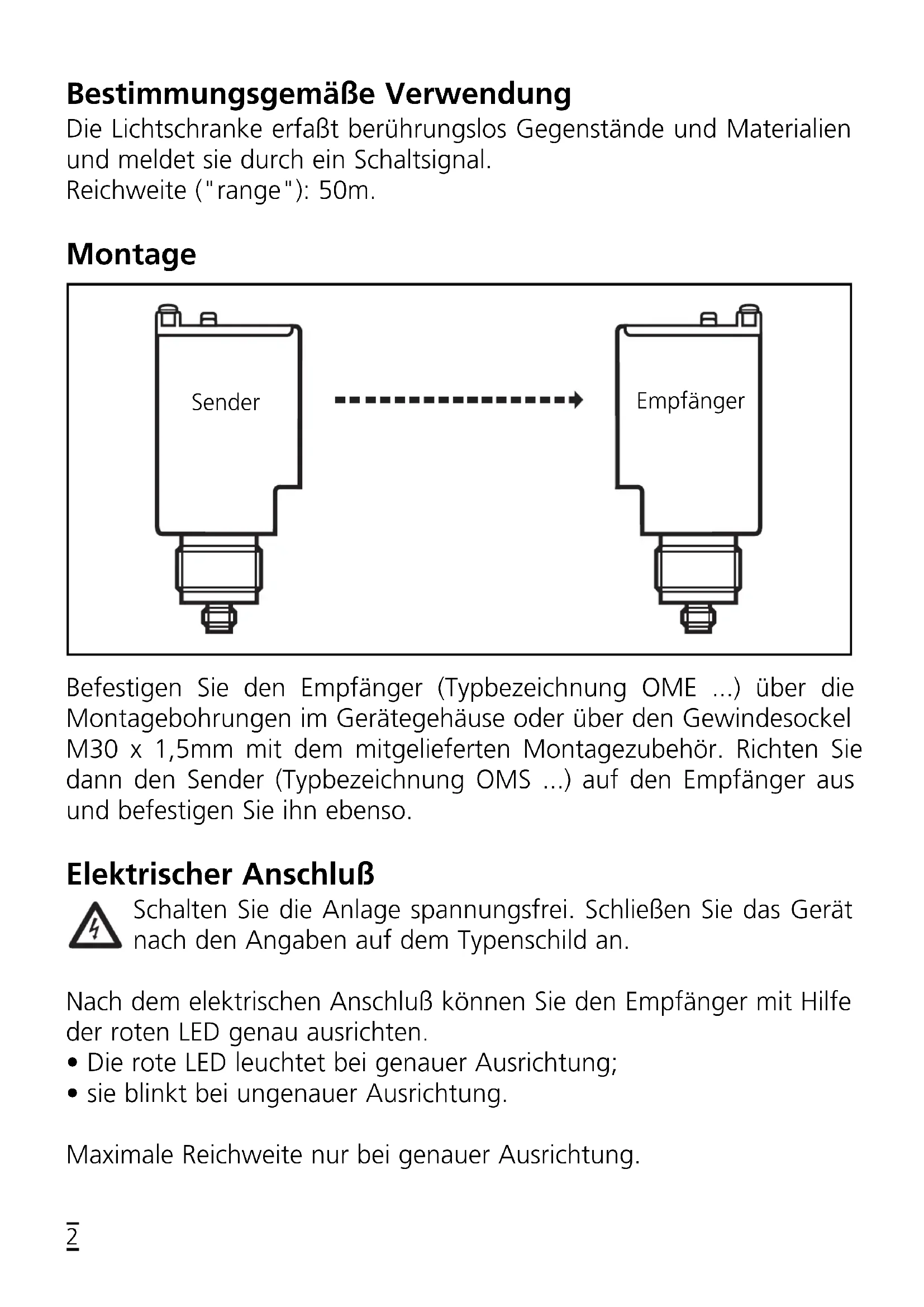 Sachnr. 701868/00 10/2004Bestimmungsgemäße Verwendung Die Lichtschranke erfaßt berührungslos Gegenstände und Materialien und meldet sie durch ein Schaltsignal. Reichweite ("range"): 50m. Montage Befestigen Sie den Empfänger (Typbezeichnung OME ...) über die Montagebohrungen im Gerätegehäuse oder über den Gewindesockel M30 x 1,5mm mit dem mitgelieferten Montagezubehör. Richten Sie dann den Sender (Typbezeichnung OMS ...) auf den Empfänger aus und befestigen Sie ihn ebenso. Elektrischer Anschluß Schalten Sie die Anlage spannungsfrei. Schließen Sie das Gerät nach den Angaben auf dem Typenschild an. Nach dem elektrischen Anschluß können Sie den Empfänger mit Hilfe der roten LED genau ausrichten.