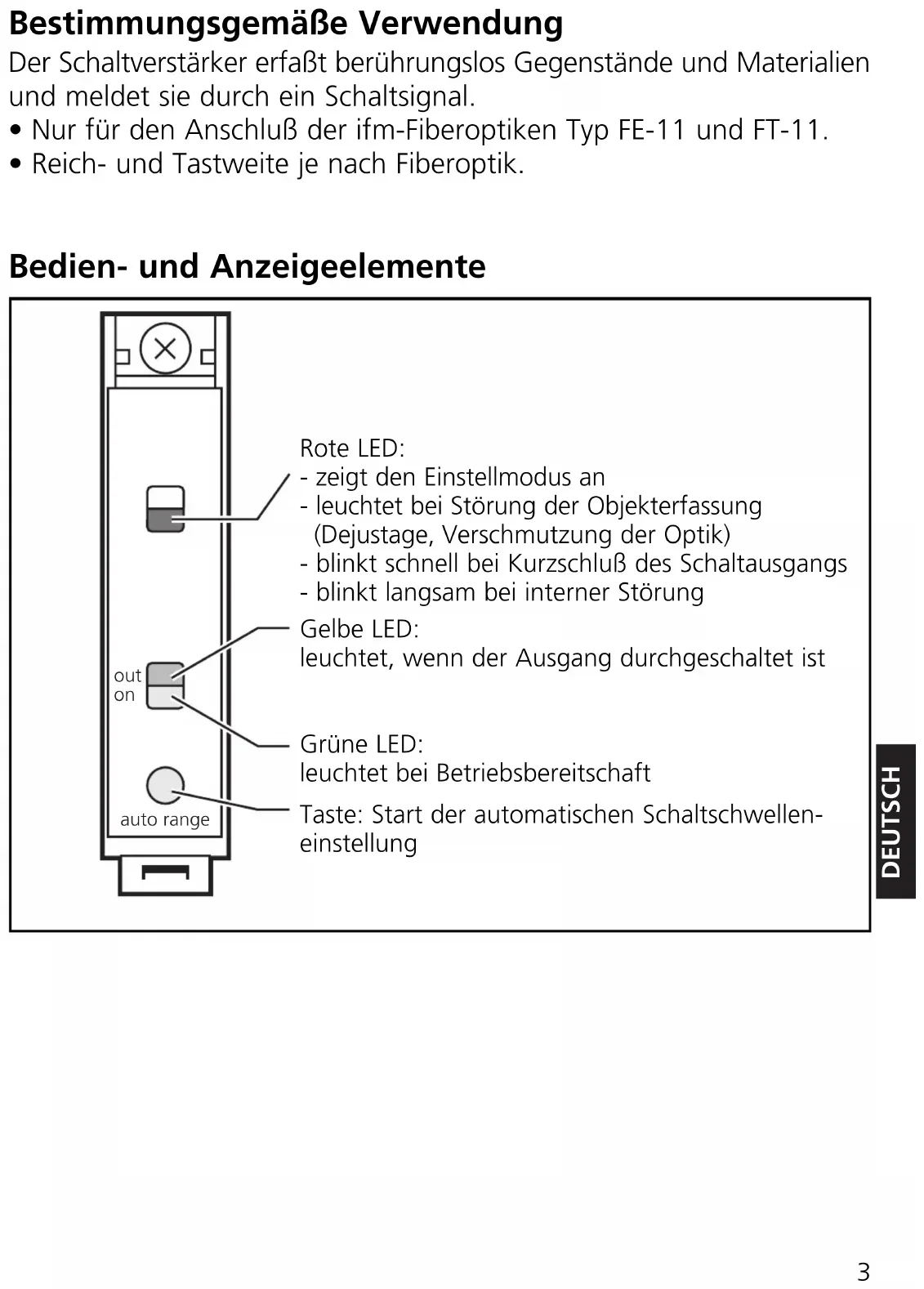 Plazieren Sie das Objekt im Erfassungsbereich der Optik.* Entfernen Sie das Objekt aus dem Erfassungsbereich der Optik.* Drücken Sie, bis rote LED blinkt. Drücken Sie 1 mal. Drücken Sie 1 mal. LEDs gelb und grün blinken im Wechsel (= Gerät ist im Programmiermodus). LEDs gelb und grün verlöschen kurzzeitig, blinken dann wieder im Wechsel. LEDs gelb und grün verlöschen kurzzeitig, danach leuchtet die grüne LED (= das Gerät ist im Betriebszustand).ENGLISH Intended use The switching amplifier senses objects and materials without contact and indicates their presence by a switching signal.