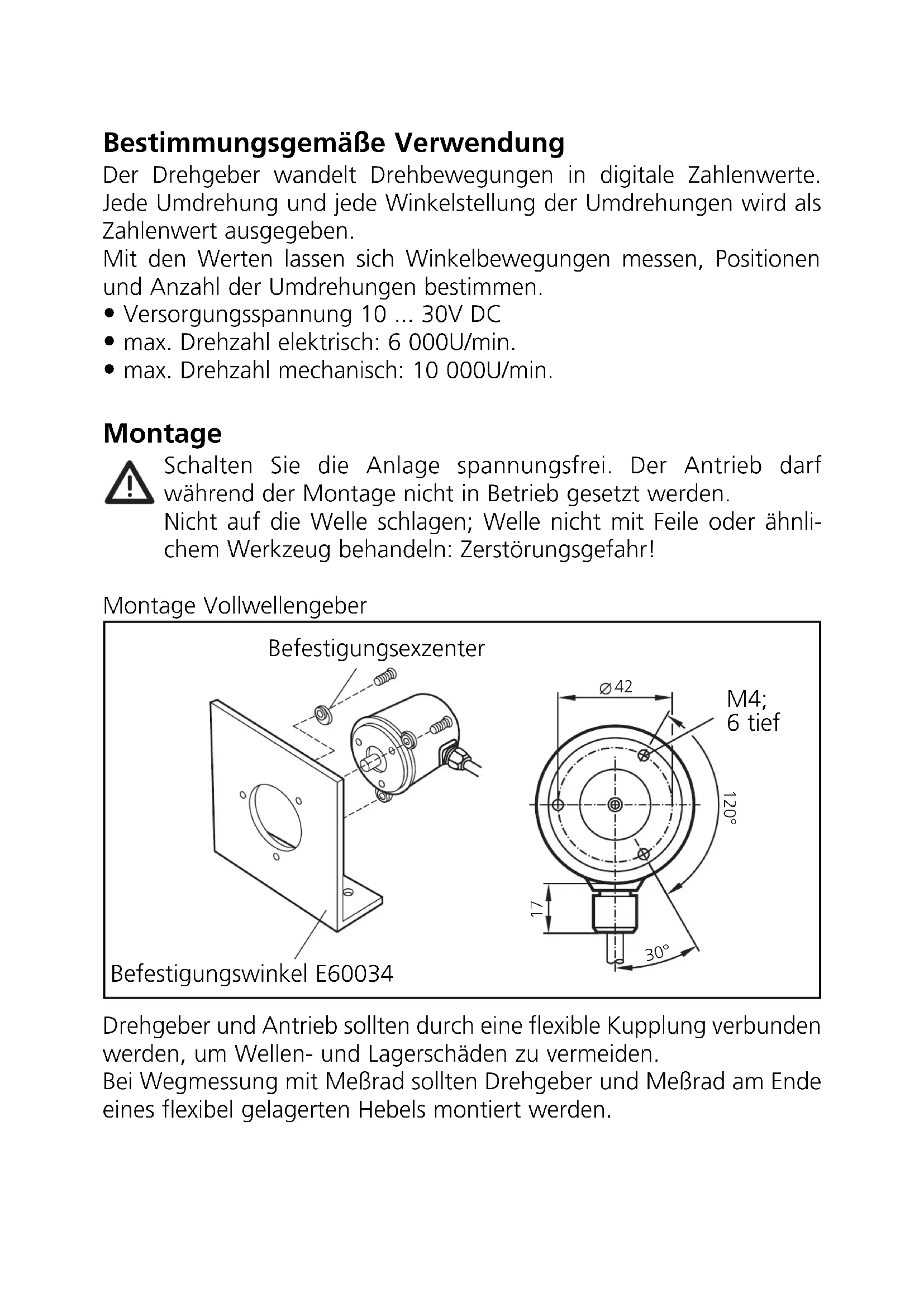 - max. Drehzahl mechanisch: 10 000U/min. Montage Schalten Sie die Anlage spannungsfrei. Der Antrieb darf während der Montage nicht in Betrieb gesetzt werden. Nicht auf die Welle schlagen; Welle nicht mit Feile oder ähnli- chem Werkzeug behandeln: Zerstörungsgefahr! Montage Vollwellengeber Drehgeber und Antrieb sollten durch eine flexible Kupplung verbunden werden, um Wellen- und Lagerschäden zu vermeiden. Bei Wegmessung mit Meßrad sollten Drehgeber und Meßrad am Ende eines flexibel gelagerten Hebels montiert werden.