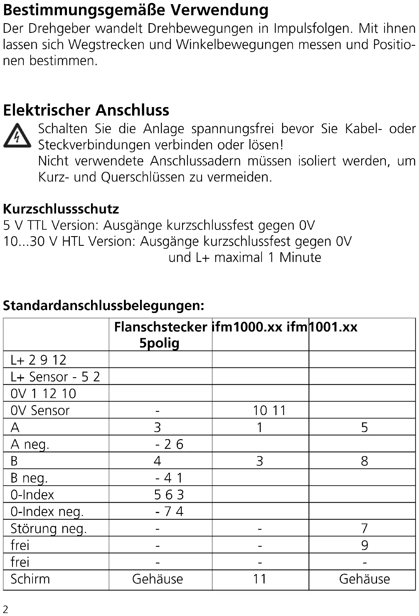 Flanschstecker ifm1000.xx ifm1001.xx 5polig L+ 2 9 12 L+ Sensor - 5 2 0V 1 12 10 0V Sensor - 10 11 A315 A neg. - 2 6 B438 B neg. - 4 1 0-Index 5 6 3 0-Index neg. - 7 4 Störung neg. - - 7 frei - - 9 frei - - - Schirm Gehäuse 11 GehäuseDie Anschlussbelegung finden Sie zusätzlich auf der Gehäusekappe. Bei Abweichungen muss der Anschluss gemäß des Aufklebers auf der Gehäusekappe vorgenommen werden. Die Anschlüsse L+ (Sensor) und 0V (Sensor) sind intern mit der Versor- gungsspannung verbunden. Bei Verwendung von Folgeelektroniken, die die Versorgungsspannung nachregeln, können diese Anschlüsse als Prüfleitungen verwendet werden. Bei Nichtverwendung sind diese Anschlüsse mit der Versorgungsspannung zu verbinden oder zu isolie- ren. Der elektrische Anschluss erfolgt je nach Ausführung über die Anschlussleitung oder separat erhältlichen Anschlussleitungen. Bei Verwendung von geeigneten Verbindungsleitungen beträgt die maximale Leitungslänge für die 5 V TTL Version 100 m und für die 10...30 V HTL Version 300 m.