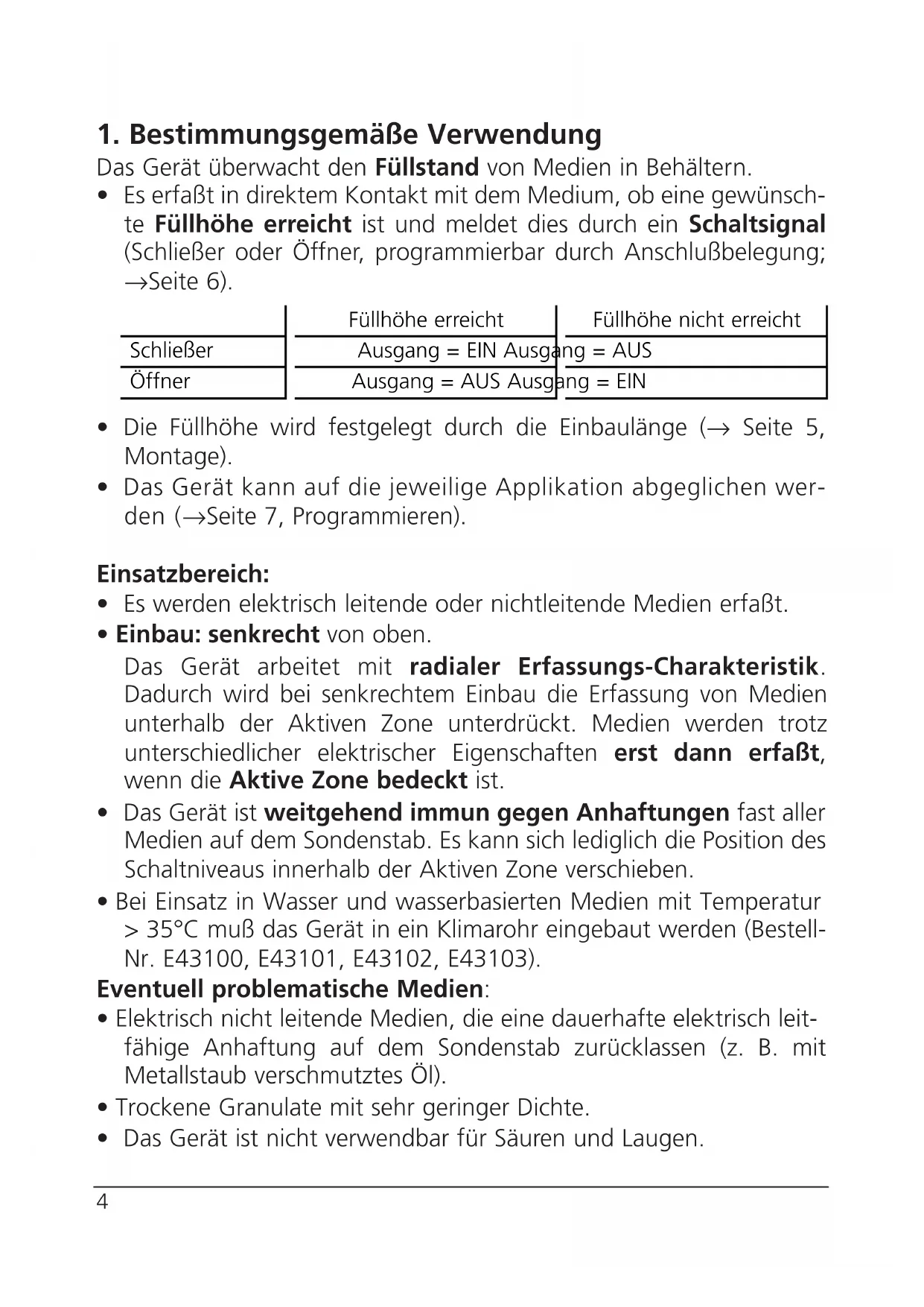 - Das Gerät kann auf die jeweilige Applikation abgeglichen wer- den (→ Seite 7, Programmieren). Einsatzbereich: