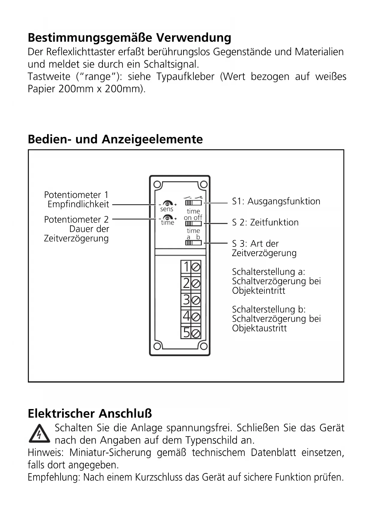 701182/04 09/2007 DEUTSCH ENGLISHFRANÇAISBestimmungsgemäße Verwendung Der Reflexlichttaster erfaßt berührungslos Gegenstände und Materialien und meldet sie durch ein Schaltsignal. Tastweite (“range”): siehe Typaufkleber (Wert bezogen auf weißes Papier 200mm x 200mm). Bedien- und Anzeigeelemente Elektrischer Anschluß Schalten Sie die Anlage spannungsfrei. Schließen Sie das Gerät nach den Angaben auf dem Typenschild an. Hinweis: Miniatur-Sicherung gemäß technischem Datenblatt einsetzen, falls dort angegeben. Empfehlung: Nach einem Kurzschluss das Gerät auf sichere Funktion prüfen.