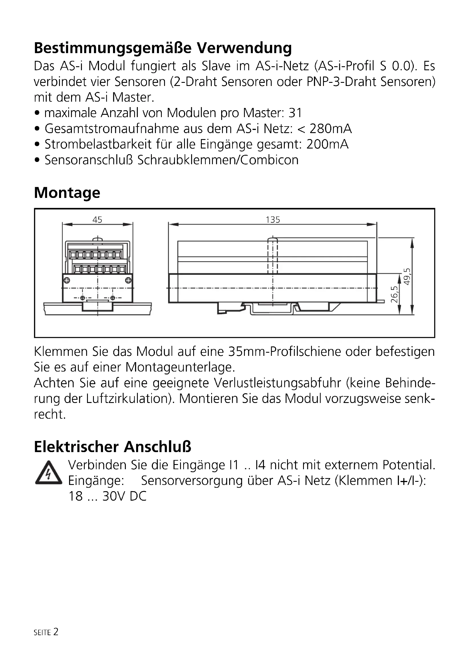 - Sensoranschluß Schraubklemmen/Combicon Montage Klemmen Sie das Modul auf eine 35mm-Profilschiene oder befestigen Sie es auf einer Montageunterlage. Achten Sie auf eine geeignete Verlustleistungsabfuhr (keine Behinde- rung der Luftzirkulation). Montieren Sie das Modul vorzugsweise senk- recht. Elektrischer Anschluß Verbinden Sie die Eingänge I1 .. I4 nicht mit externem Potential. Eingänge: Sensorversorgung über AS-i Netz (Klemmen I+/I-): 18 ... 30V DC SEITE 2