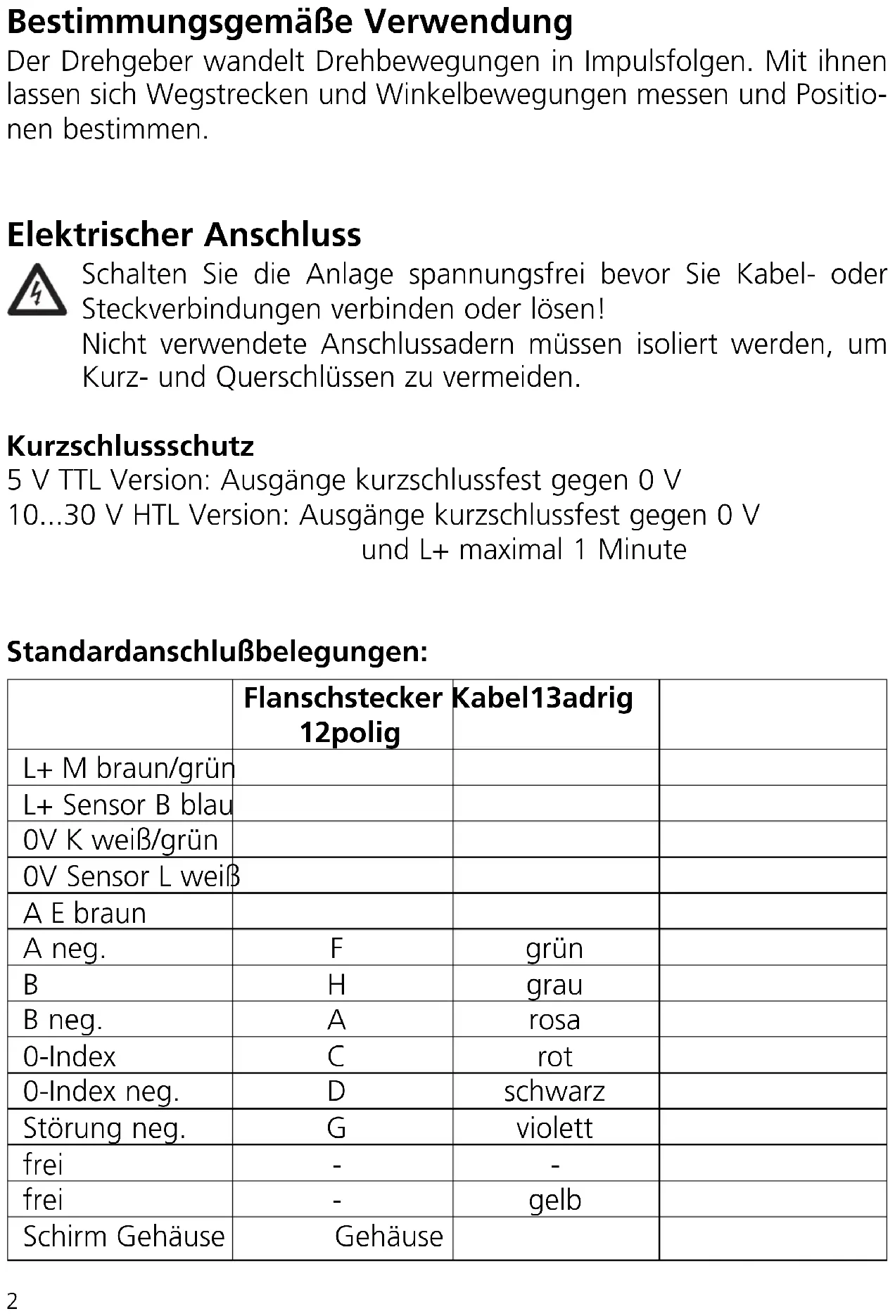 IdentNr. 514563 -01 Sachnr. 701858/02 08/2010Bestimmungsgemäße Verwendung Der Drehgeber wandelt Drehbewegungen in Impulsfolgen. Mit ihnen lassen sich Wegstrecken und Winkelbewegungen messen und Positio- nen bestimmen. Elektrischer Anschluss Schalten Sie die Anlage spannungsfrei bevor Sie Kabel- oder Steckverbindungen verbinden oder lösen! Nicht verwendete Anschlussadern müssen isoliert werden, um Kurz- und Querschlüssen zu vermeiden. Kurzschlussschutz 5 V TTL Version: Ausgänge kurzschlussfest gegen 0 V 10...30 V HTL Version: Ausgänge kurzschlussfest gegen 0 V und L+ maximal 1 Minute Standardanschlußbelegungen: