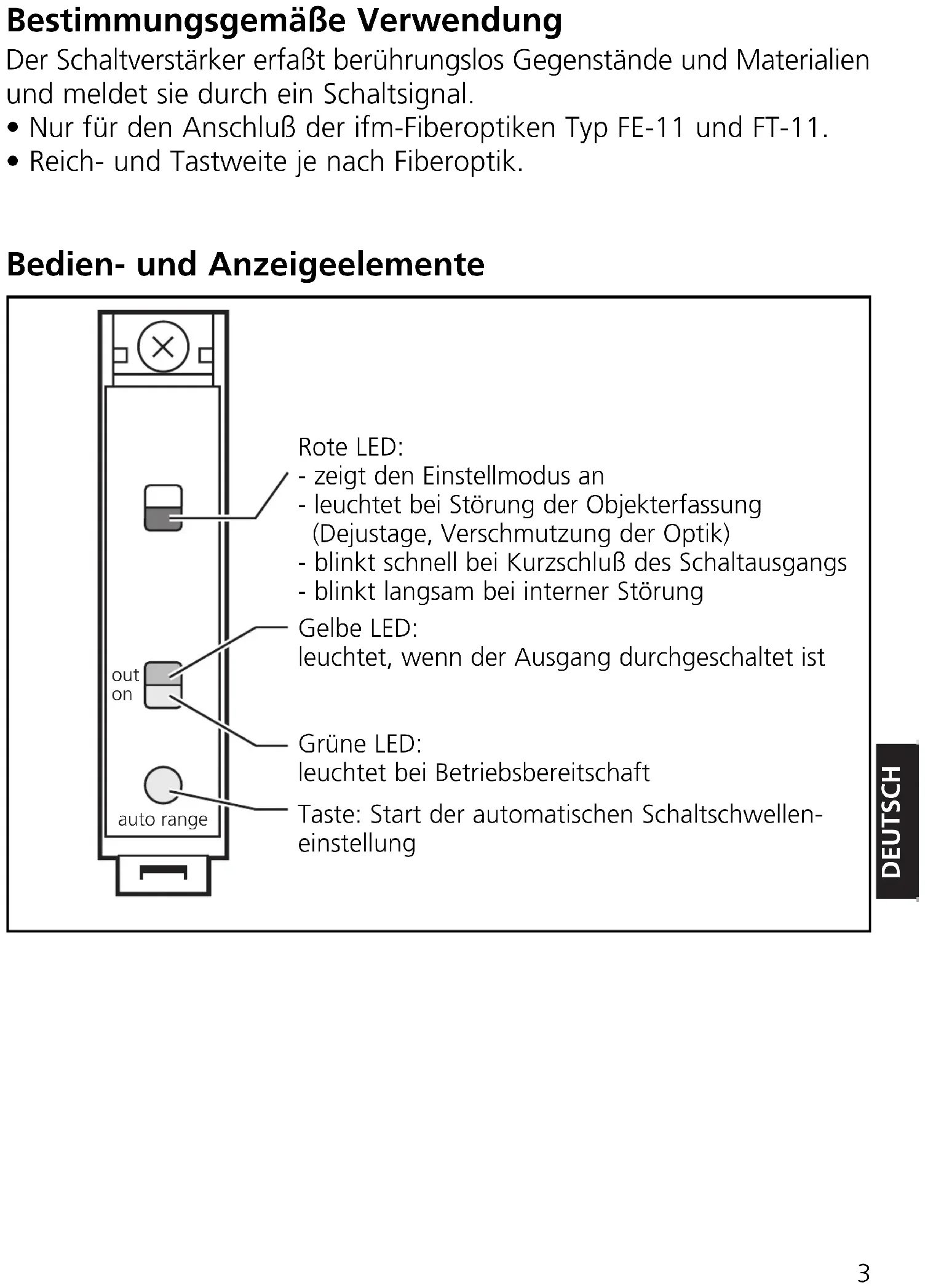 Sachnr. 701232/01 01/1999Deutsch Seite Bestimmungsgemäße Verwendung 3 Bedien- und Anzeigeelemente 3 Montage 4 Adaptieren der Lichtleiter 4 Elektrischer Anschluß 4 Schaltschwelle einstellen 5, 6 Anschluß 15 English Intended use 7 Controls and indicators 7 Mounting 8 Mount the fibre optics 8 Electrical connection 8 Setting of the switching threshold 9, 10 Connection 15 Français Fonctionnement et caractéristiques 11 Eléments de service et d’indication 11 Montage 12 Monter les fibres optiques 12 Raccordement électrique 12 Réglage du seuil de commutation 13, 14 Raccordement 15 2DEUTSCH Bestimmungsgemäße Verwendung Der Schaltverstärker erfaßt berührungslos Gegenstände und Materialien und meldet sie durch ein Schaltsignal.